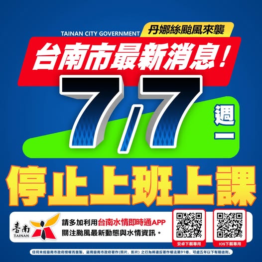 明天 7/7(一)台南市停止上班上課