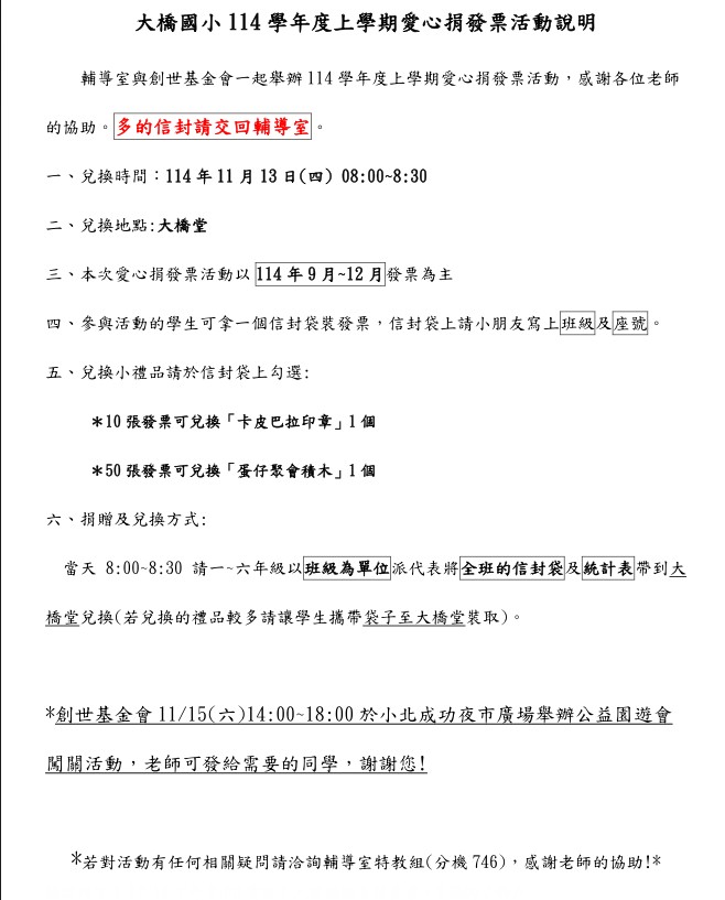3.記得於 11/13 早上到校後交給老師帶至大橋堂兌換