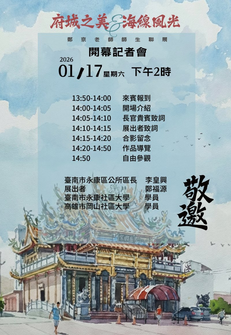 一、本所邀請藝術家鄭京(本名鄭福源)於本區社教中心展示廳辦理旨揭展覽,展出鄭京老師師生走訪府城與永康之戶外寫生創作,從建築、廟宇及日常生活中觀察文化脈絡, 將感受化為畫作意象,呈現南臺灣的城市風貌與人文溫度,讓觀者在欣賞畫作同時,看見土地故事與文化魅力。