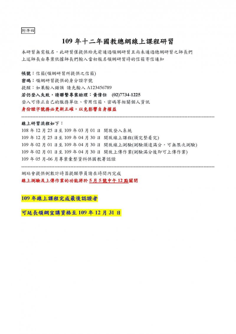 六、國民及學前教育署另為協助已通過領綱認證未參加總綱培訓之種子講師,延長可持續宣講通過之領綱一年。另規劃總綱線上課程研習,線上研習業於 108 年 12 月初開放報名,已完成線上研習及認證程序者即可持續宣講通過之領綱至 109 年 12 月 31 日。(詳如附件 2 )