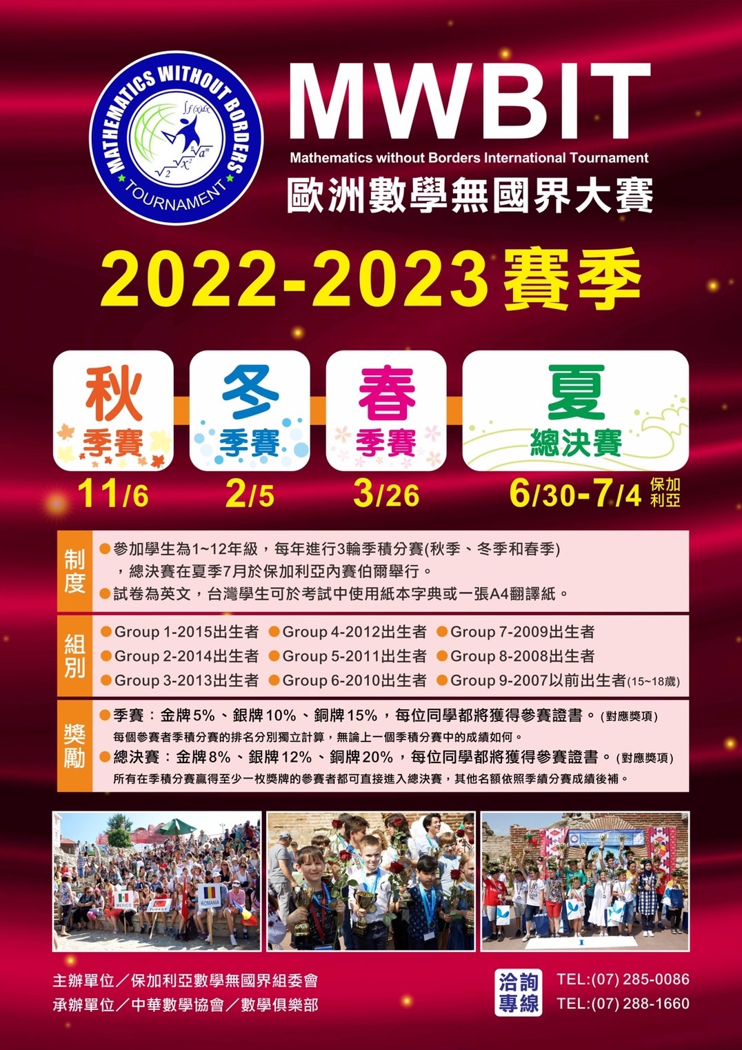 「2022~2023 賽季數學無國界大賽(Mathematics Without Borders International Tournament ,簡稱 MWBIT)」秋季賽,將於 2022 年 11 月 06 日 下午 2 點舉行。如欲報名,還請聯繫競賽窗口申請。詳細資訊如附件。