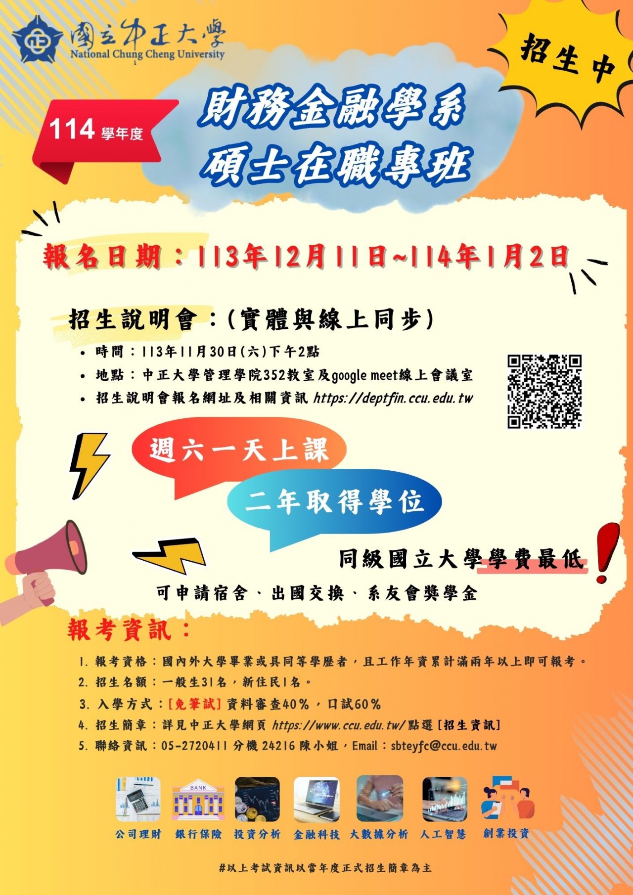 國立中正大學財務金融學系碩士在職專班114學年度招生資訊