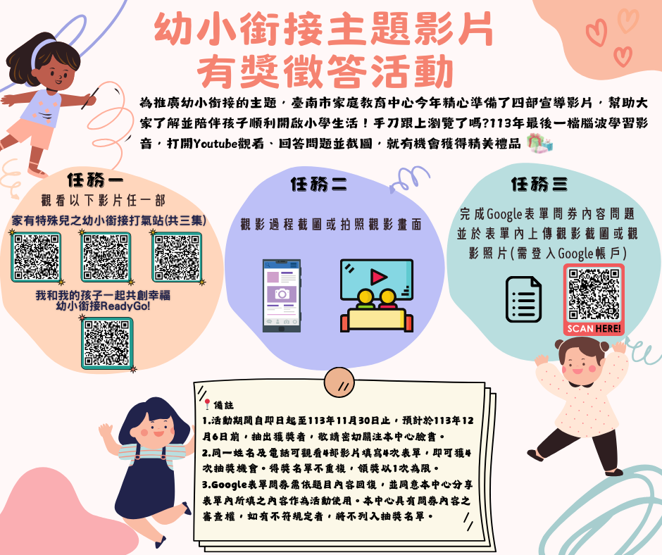 主旨:臺南市家庭教育中心辦理 113 年度幼小銜接主題影片有獎徵答活動,鼓勵學生家長踴躍參加。