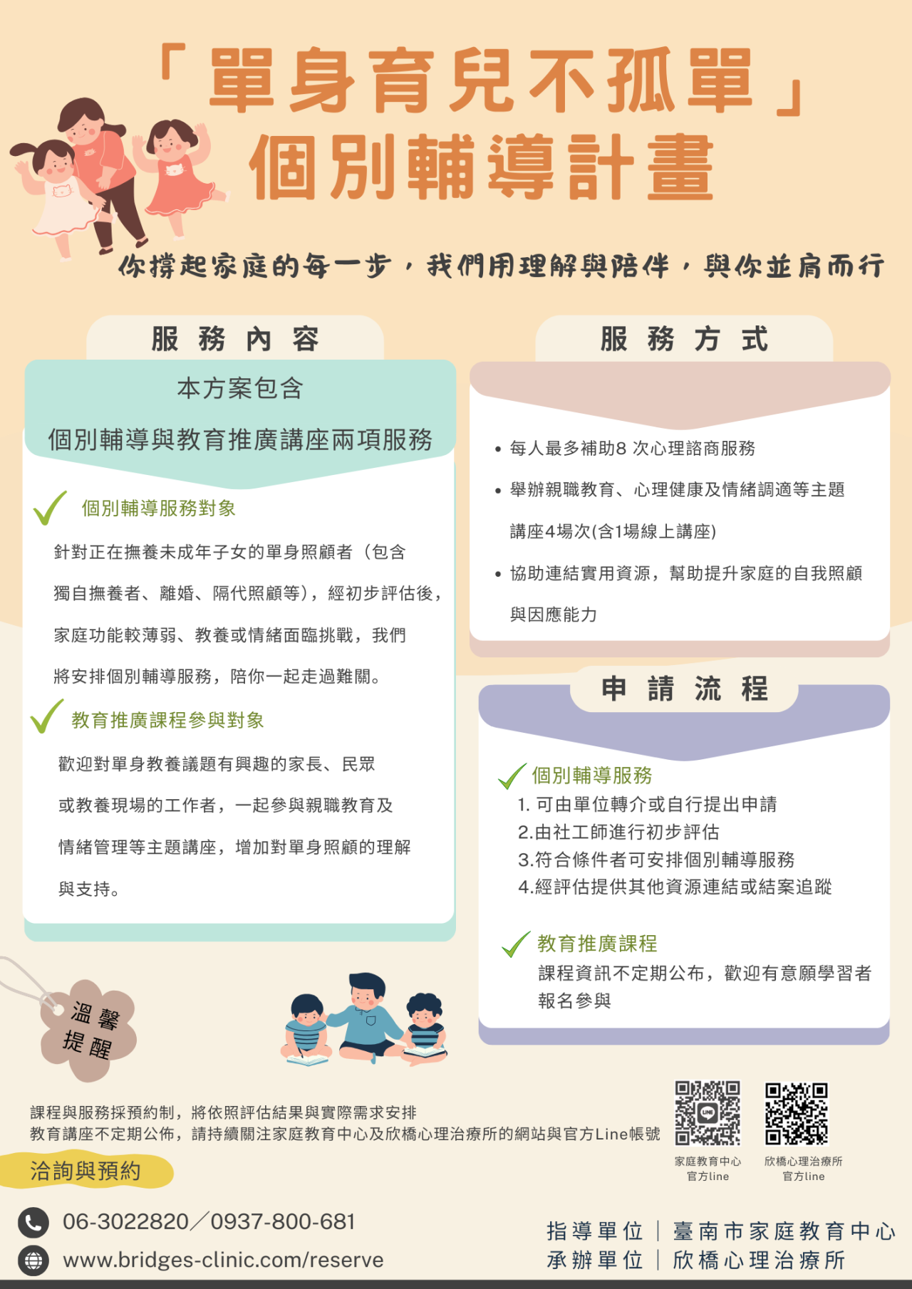 主旨:有關本中心委託欣橋心理治療所辦理「單身育兒不孤單」個別輔導計畫,請轉知運用,請查照。