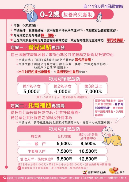 2 歳至未滿 5 歲育兒津貼:自 111 年 8 月 1 日起,家中有生理年齡滿 2 歲至當學年度 9 月 1 日前未滿 5 歲之本國籍幼兒,除配合中央設定排富條款外,補助額度提高為每月 5,000 元,第二名子女加發 1,000 元,第三名以上子女加發 2,000 元,正在領取該名幼兒之育嬰留停津貼者,可同時請領。請至幼兒戶籍所在地公所提出申請。