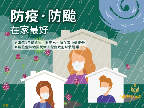內政部為落實民眾自主防災意識,提高備置防災用品及食物之意願及便利性,於每年颱風季前及國家防災日之時機,鼓勵各賣場及網路平臺設置防颱(災)專區,並提供防颱及防災宣導相關素材,供民眾下載使用。
