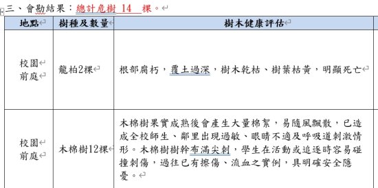 本校定期申請經費維護校樹,經樹木專家勘查評估後,有 14 棵危樹樹木須移除,避免樹木倒塌,影響全校師生安全預計於 115 年 4-6 月進行樹木移除。特此公告。