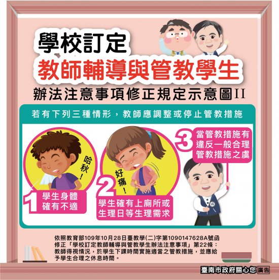 三、檢附「學校訂定教師輔導與管教學生辦法注意事項修正規定示意圖」2 幅供參。