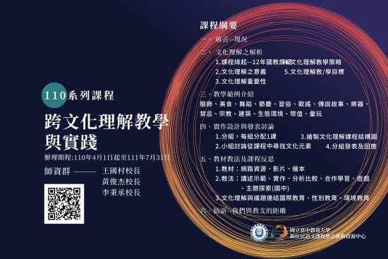 二、為協助師資了解文化理解之重要性及教學目標,並介紹教學範例及講述示範教材教法,本局特辦理旨案研習並邀請高雄市河堤國小王校長國村及苗栗縣成功國小黃校長俊杰擔任講師。