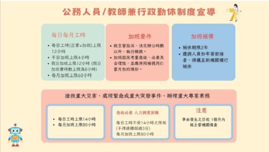 因應司法院釋字第 785 號解釋,公務員服務法及公務人員保障法業於 111 年 6 月 22 日修正公布,行政院基於兼顧公務同仁健康權及機關實務運作,訂定「行政院與所屬中央及地方各機關(構)公務員服勤實施辦法」於 112 年 1 月 1 日施行,就公務員服勤時數訂定上限規範、服勤與休假之頻率及服勤日中連續休息最低時數。