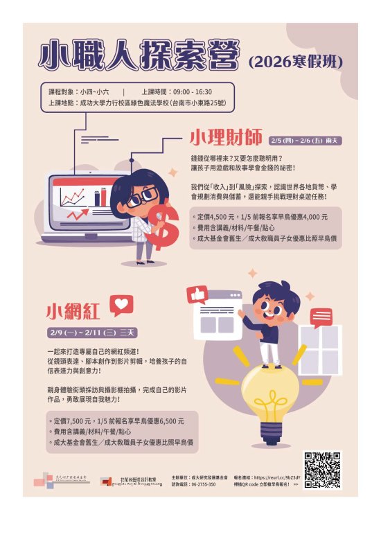 一、旨揭活動乃專為 4 至 6 年級學童設計之專屬課程,讓孩子化身 2 種職業角色,從玩樂中學習,從體驗中成長。 2 大主題:「小網紅」體驗影片拍攝與自我表達、「小理財師」學會金錢觀念與儲蓄規劃。