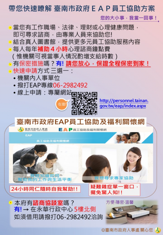 為提供臺南市所屬公務同仁更完善的員工協助方案(EAP),特規劃整合相關資源建置「臺南市政府 EAP 員工協助及福利關懷網」,其網址為 http://personnel.tainan.gov.tw/eap/index.aspx ,建議使用最佳瀏覽器版本為: Google Chrome 、 Internet Explorer11 以上版本。