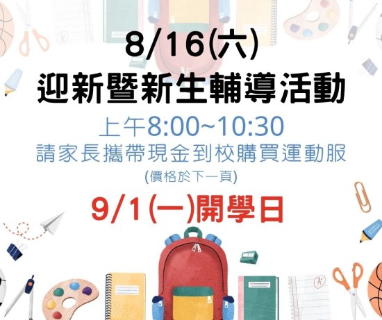 本校於 114 年 8 月 16 日(六)上午 8:00~10:30 進行迎新與新生輔導活動, 9 月 1 日(一)開學日。
