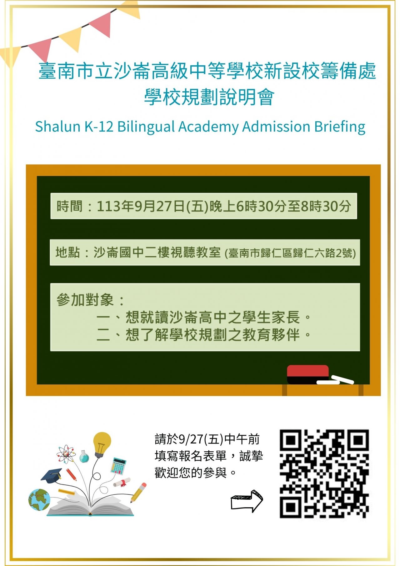 主旨:為協助學生規畫升學進路,彙集學區家長意見,本籌備處辦理「臺南市立沙崙高級中等學校新設校─招生規劃說明會」,敬請惠允於貴校校網公告訊息,誠摯邀請學區內應屆畢業生之家長參加,請查照。