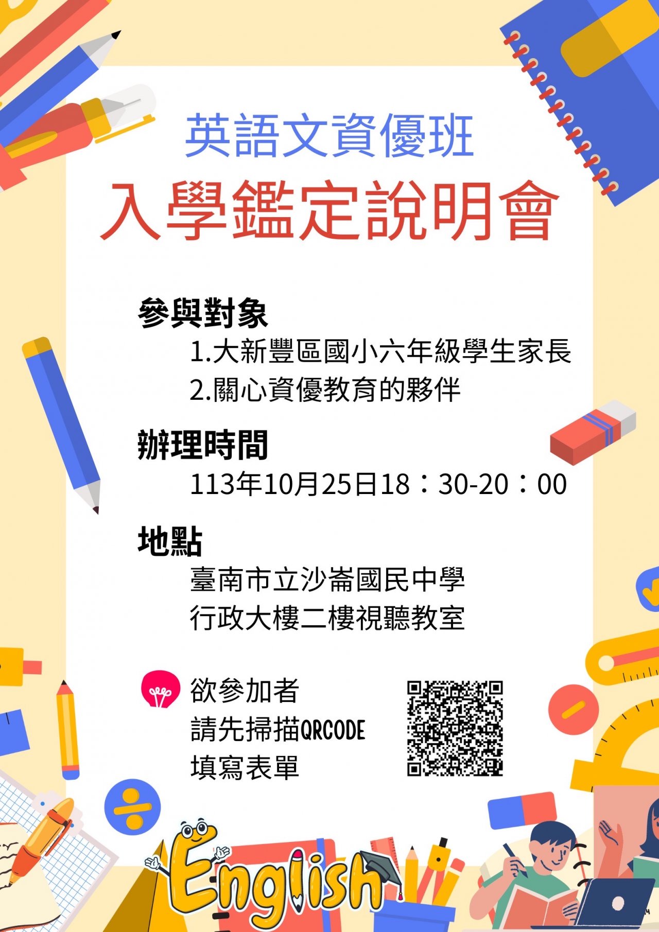 主旨:檢送本校辦理英語文資優鑑定家長說明會宣傳單乙份(如附件),請協助轉知活動訊息,請 查照。 說明: 一、依教育局公告 248614 號,本校訂於 113 年 10 月 25 日(五)18 : 30 辦理英語文資優鑑定家長說明會場次。 二、為掌握出席人數,懇請 貴校惠予協助將相關訊息公告校網或轉發六年級班級群組。 三、如有任何疑問,請聯繫沙崙國中輔導室林君慧主任 06- 3032062 轉分機 501 。