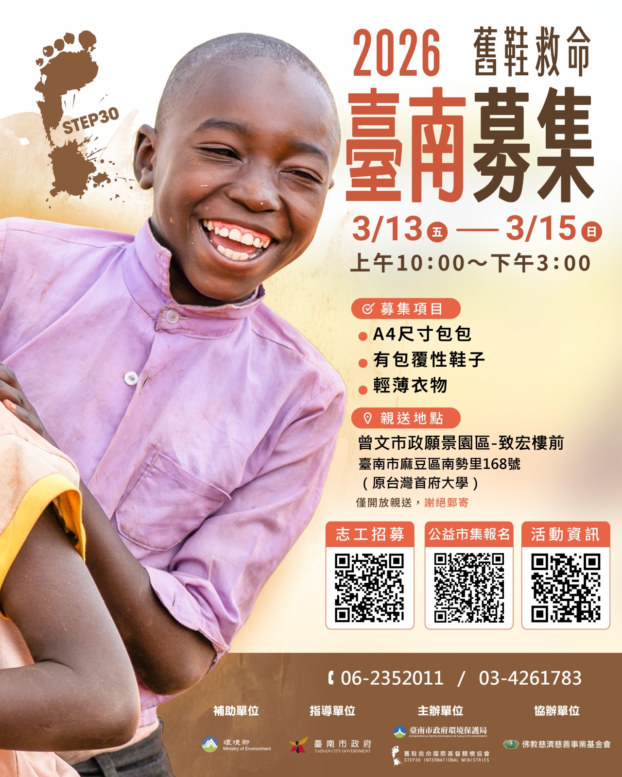 一、本會將於民國115年3月13日(星期五)至3月15日(星期日),假臺南市麻豆區曾文市政願景園區-致宏樓前廣場辦理「2026臺南舊鞋救命二手物資募集活動」。