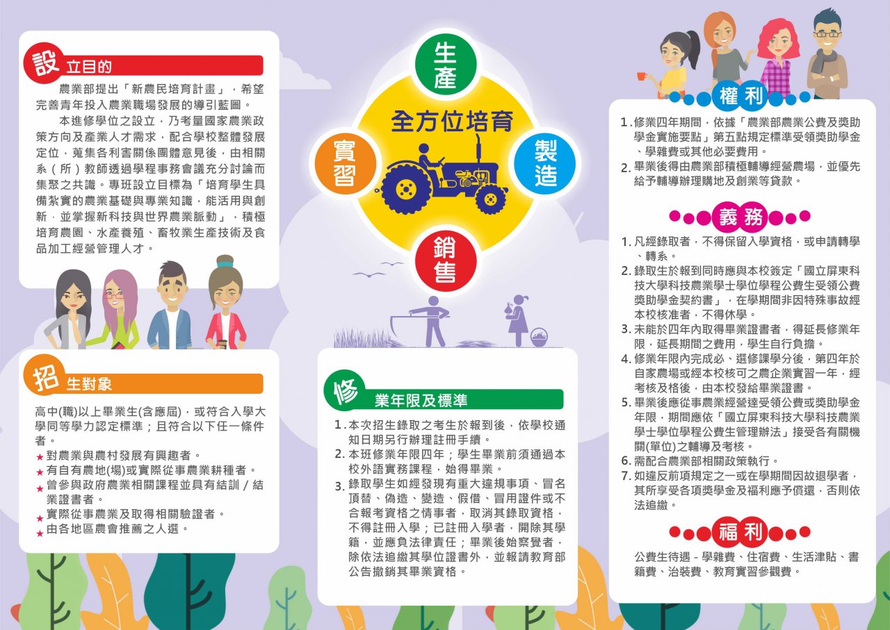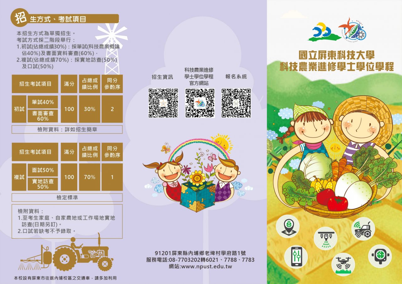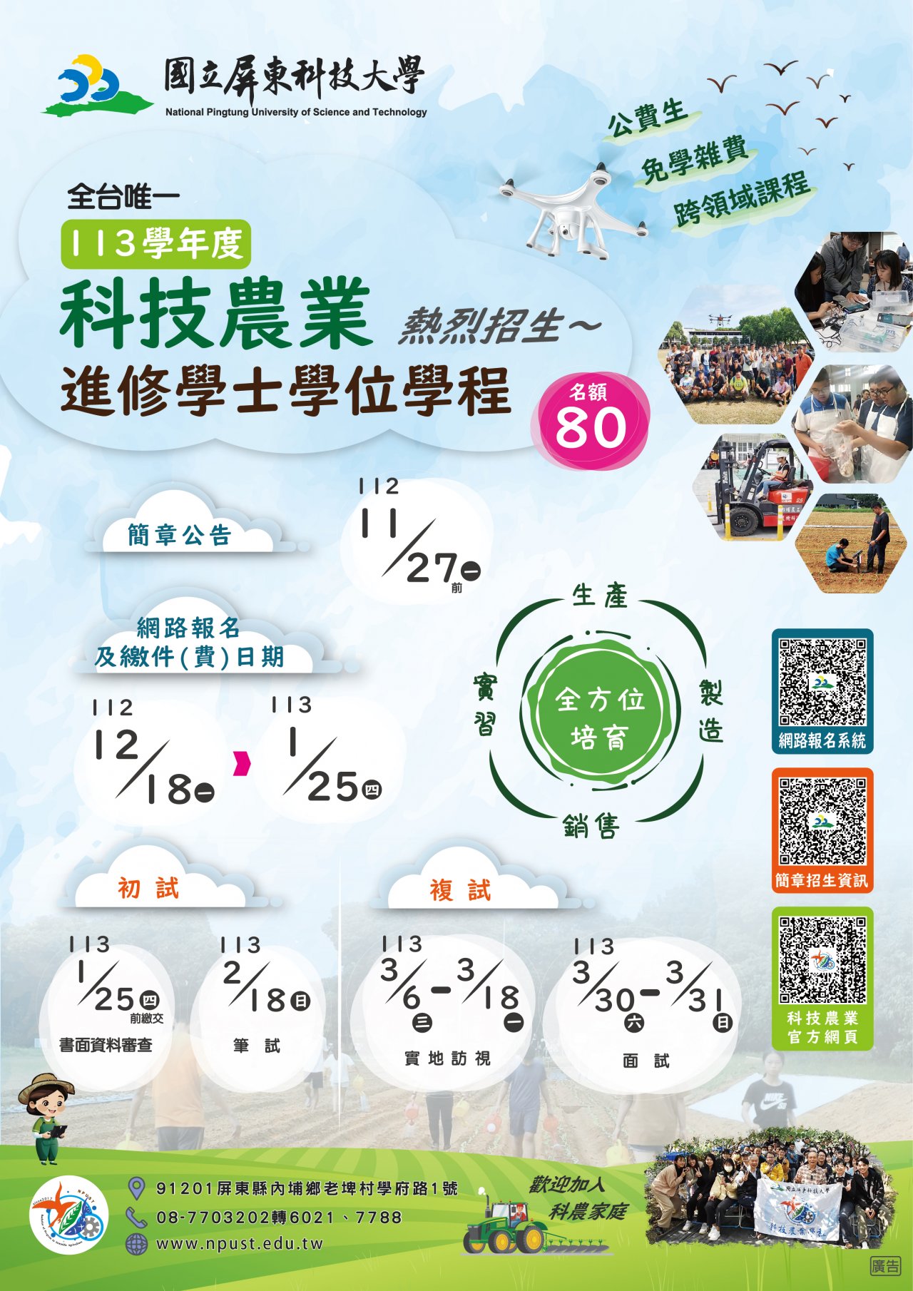 說明: 一、本校已於112年11月22日公告113學年度科技農業進修學士學位學程單獨招生簡章。 二、網路報名及繳件(費)時間為112年12月18日(星期一)至113年1月25日(星期四) 止, 報名網址:https://admissions.npust.edu.tw/graportal/UniverMain/Univer1/Index.aspx。 三、檢附旨揭113學年度招生海報、三摺頁及簡章電子檔。