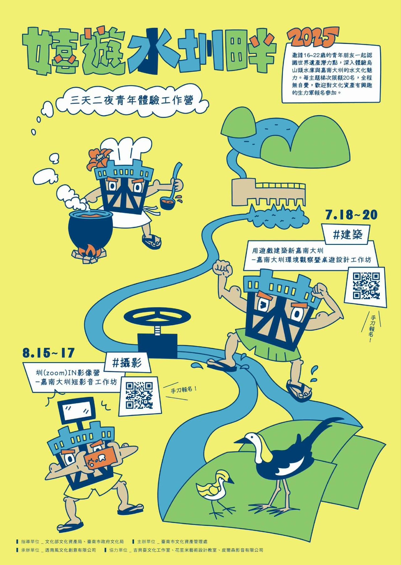一、為啟發青年對於世界遺產潛力點「烏山頭水庫暨嘉南大圳水利系統」的認識與關注,本處委託透南風文化創意有限公司辦理「嬉遊水圳畔」青年體驗工作營,招募對文化資產議題感興趣之青年朋友參與,透過實地參訪與實作體驗深入認識烏山頭水庫暨嘉南大圳文資價值,培育新生代對於世界遺產潛力點的探索及視野。↵
