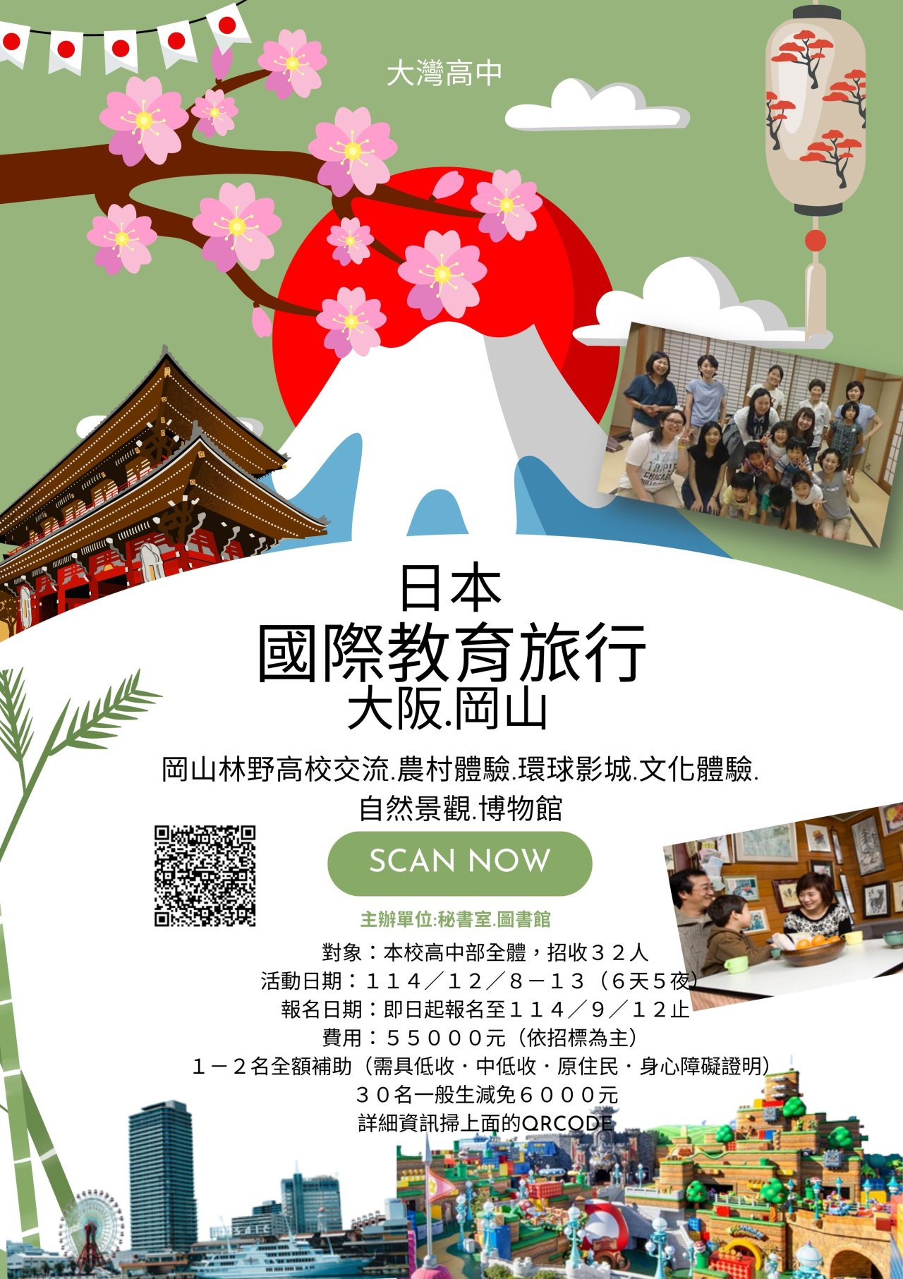 本校將於114年12月上旬辦理「日本國際教育旅行」活動,將與姊妹校日本林野高校進行交流,推行「讀萬卷書不如行萬里路」之國際觀,增廣見聞,請有意願之同學踴躍報名參加!