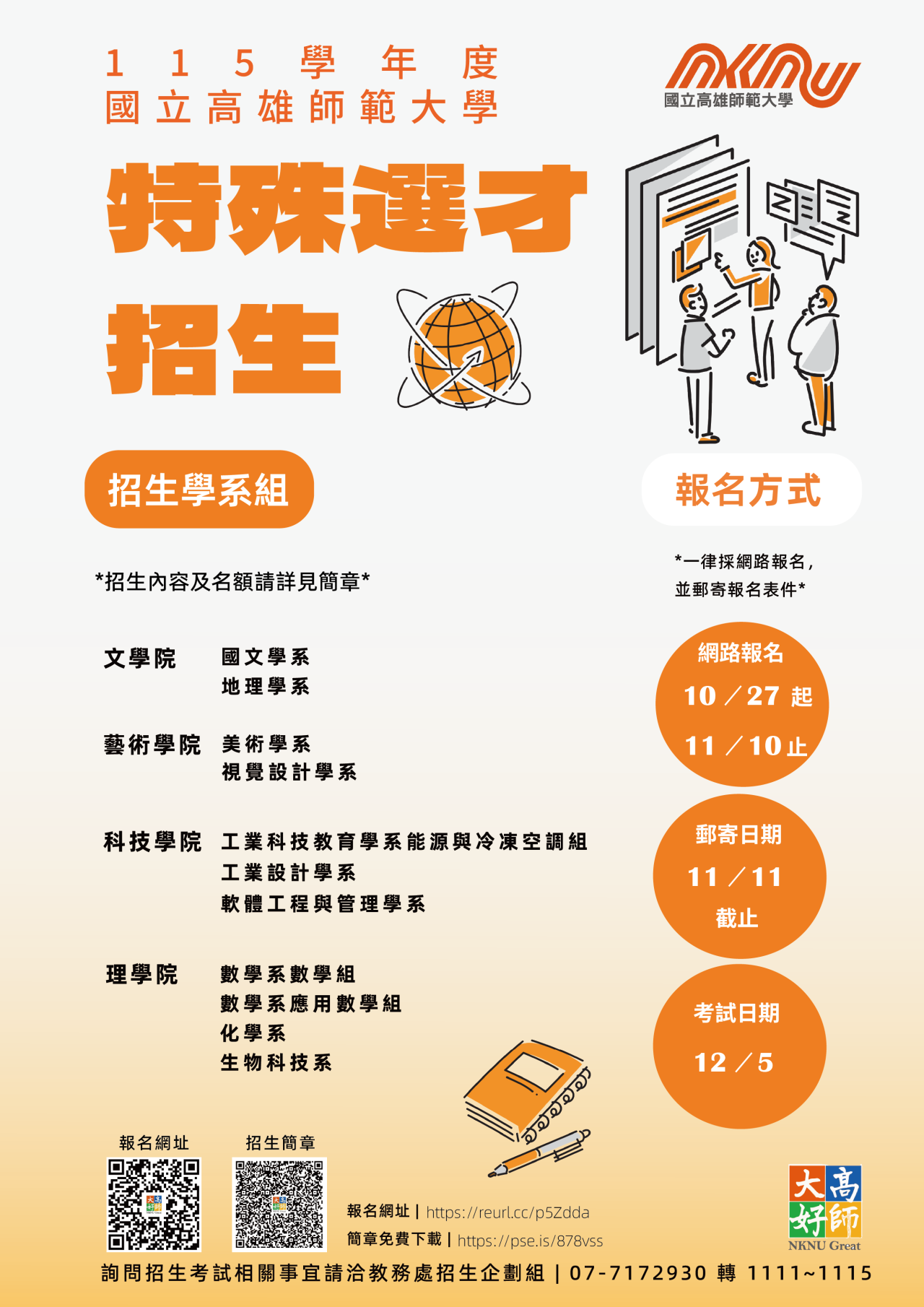 二、特殊選才招生學系:國文學系、地理學系、美術學系、視覺設計學系、數學系(數學組、應用數學組)、化學系、生物科技系、工業設計學系、工業科技教育學系(能源與冷凍空調組)、軟體工程與管理學系、軟體工程與管理學系(資安外加)等12個校系組,提供26名招生名額。