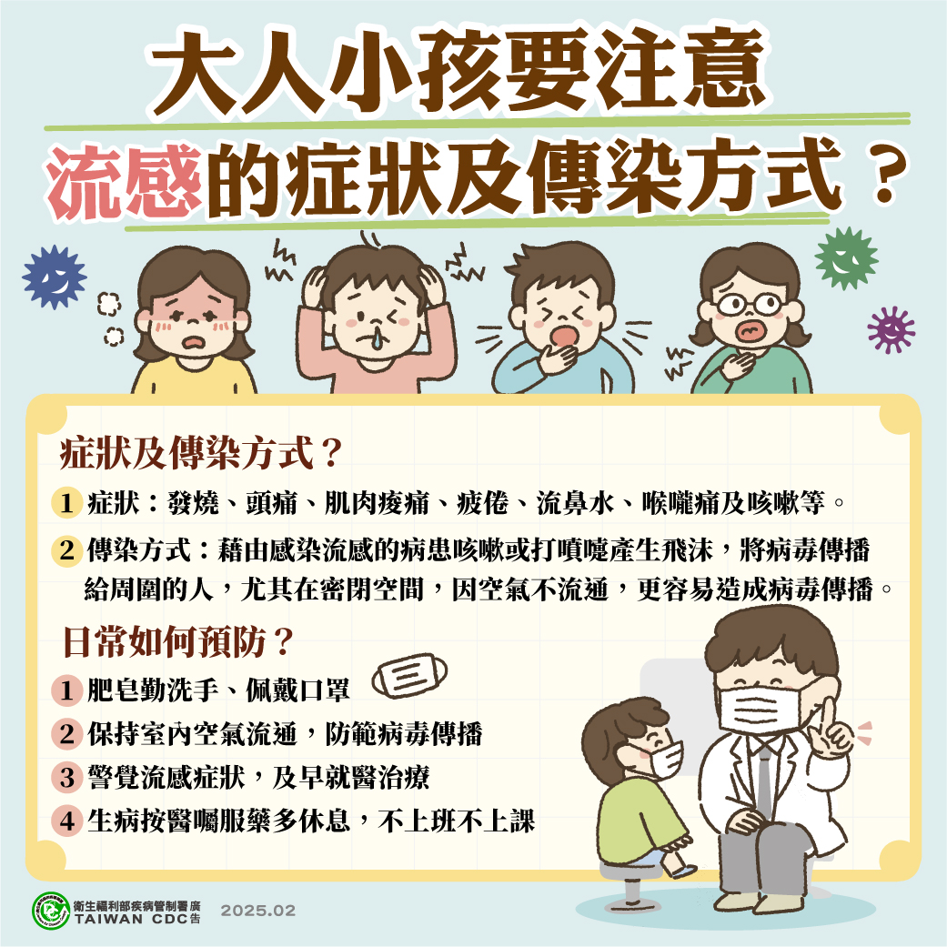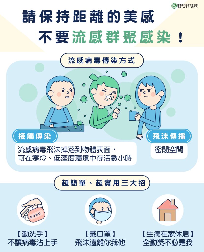 二、依據衛生福利部疾病管制署疾病監測資料顯示,目前國內流感群聚疫情有上升趨勢,學生與幼兒為流感病毒之高傳播及高風險族群,爰請學校確依旨揭指引執行相關防疫措施,包含平時應強化衛生教育宣導與提高警覺,以及落實生病不上班、不上課;發生疑似群聚事件時,應以落實感染管制措施為主要作為,並即時通報衛生單位,配合進行疫情調查,以防範流感疫情於校園內傳播。