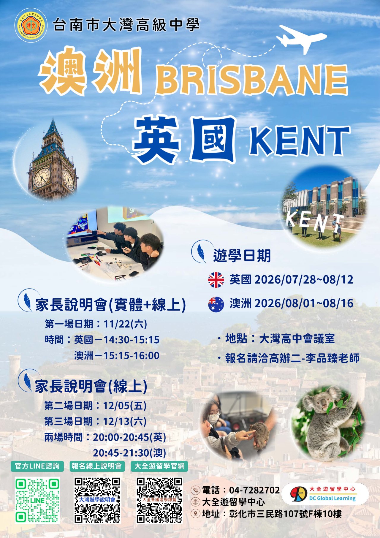 ※各梯次內容一樣,同學及家長可擇一報名。有任何問題諮詢或報名,請洽大灣高中高辦二李品臻老師,聯絡電話(06)2714223分機28