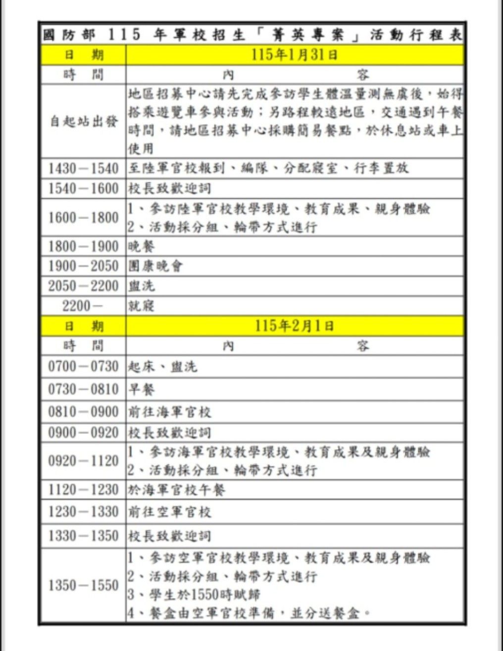 轉知國防部辦理「115 年軍校招生活動」(兩天一夜),資訊如下:
