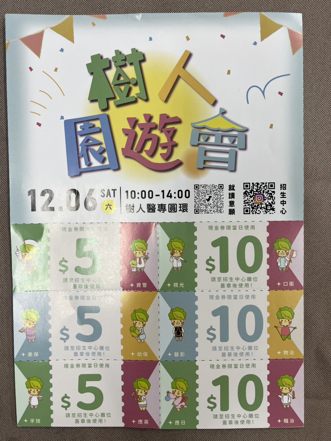 若有需要樹人醫專園遊會現金券(12/6星期六上午10點至下午2點)的學生,請至輔導室資料組索取。