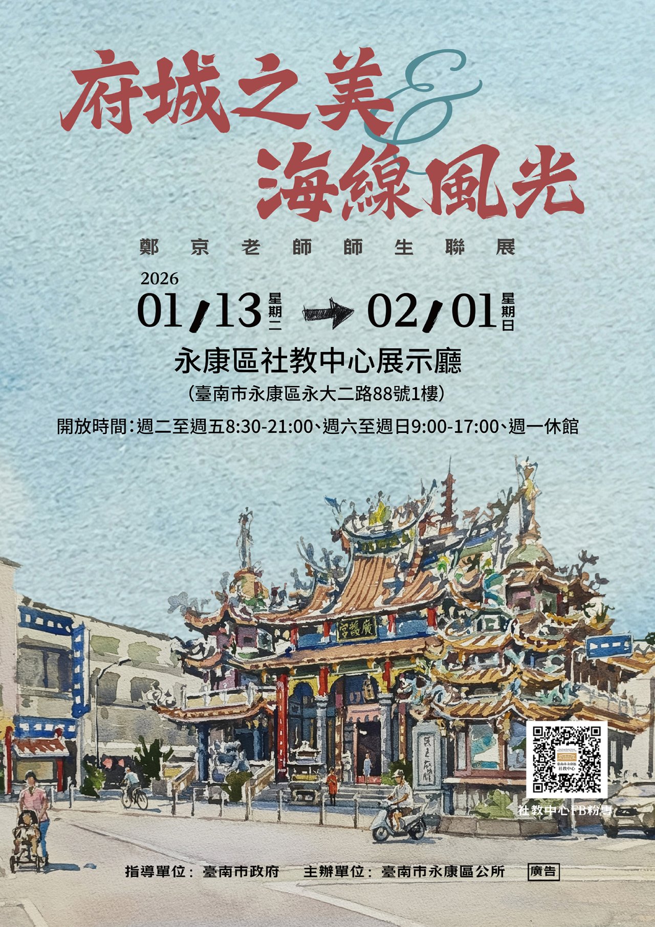一、本所邀請藝術家鄭京(本名鄭福源)於本區社教中心展示廳辦理旨揭展覽,展出鄭京老師師生走訪府城與永康之戶外寫生創作,從建築、廟宇及日常生活中觀察文化脈絡,將感受化為畫作意象,呈現南臺灣的城市風貌與人文溫度,讓觀者在欣賞畫作同時,看見土地故事與文化魅力。