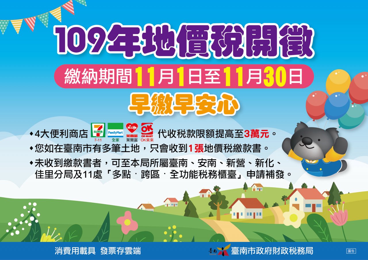 109年地價稅開徵日期自109年11月1日至同年11月30日止,請協助廣為宣導,以提醒納稅義務人如期繳納稅款。