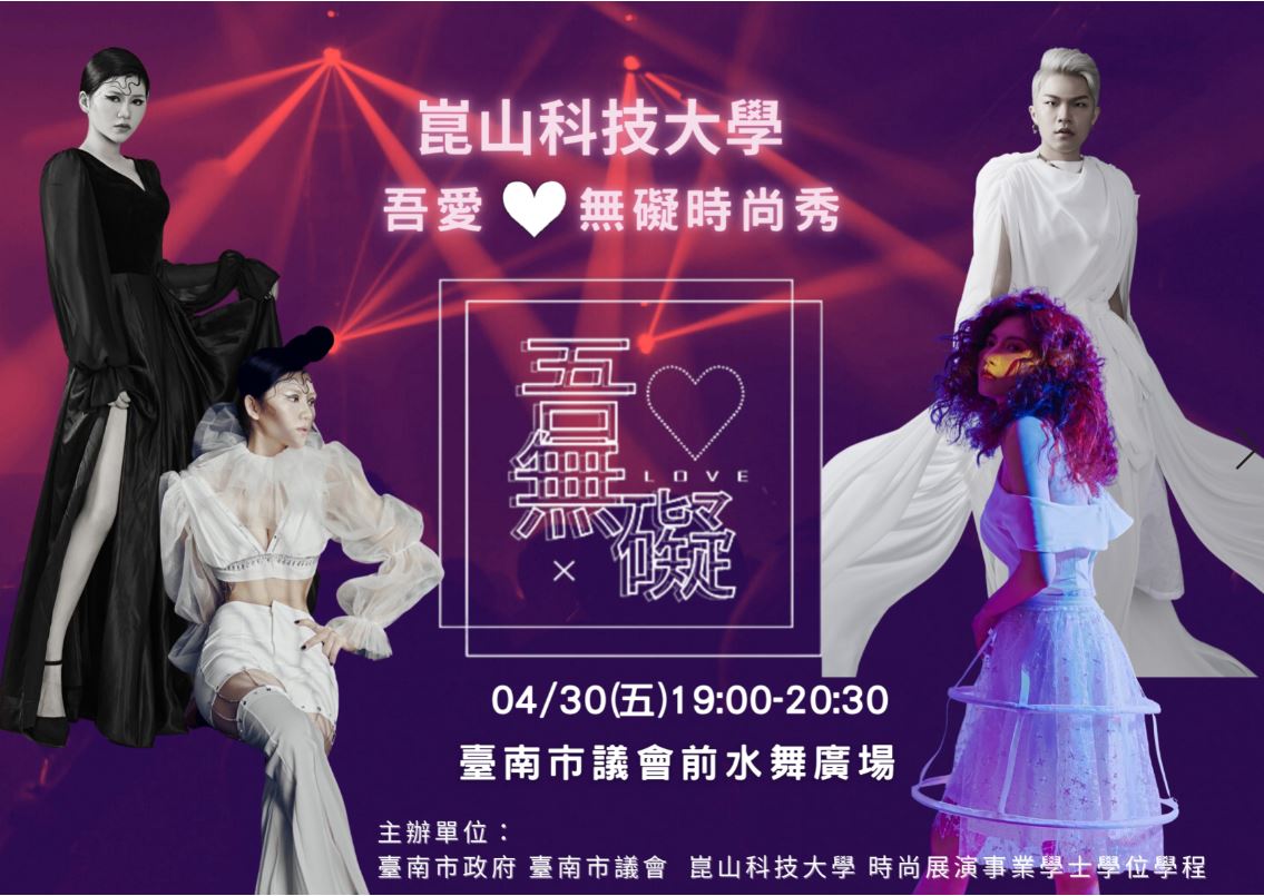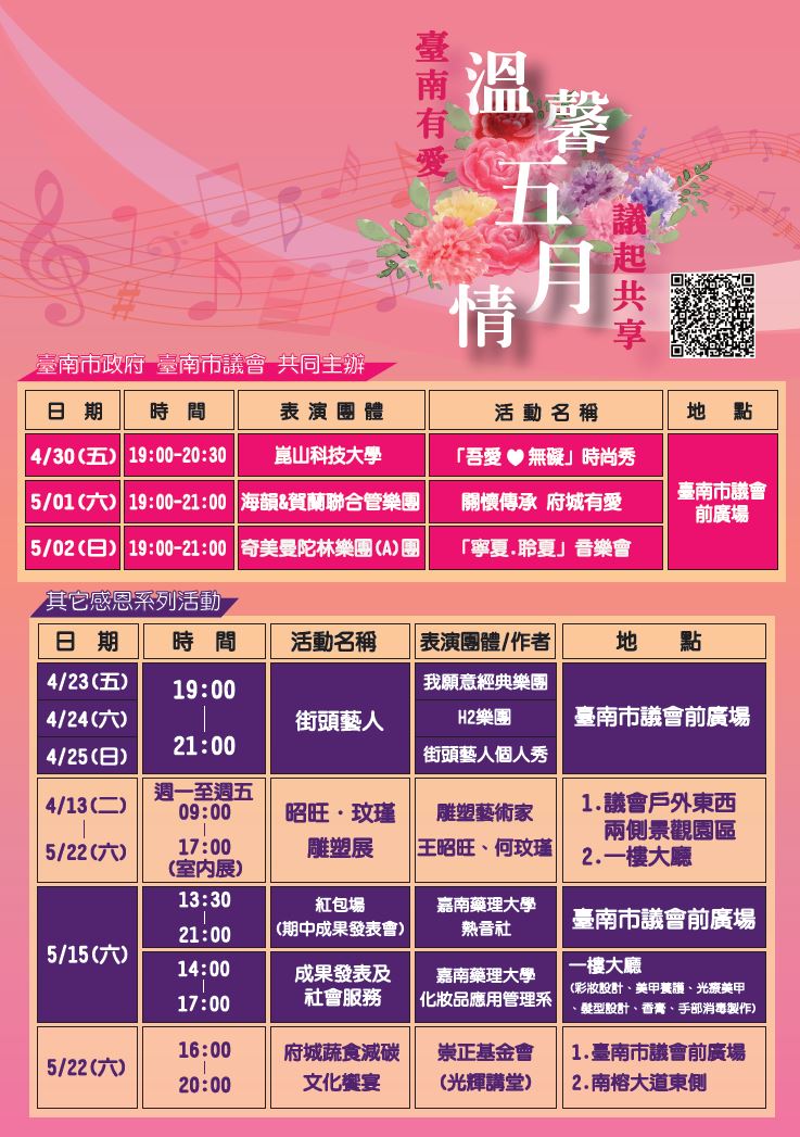 一、演出地點:臺南市議會前水舞廣場(臺南市安平區永華路2段2號)。 二、演出時間:110年4月30日(星期五)至5月2日(星期日)每天下午19時開始。 三、4月30日由崑山科技大學展演-「吾愛 無礙」時尚秀;5月1日由海韻&賀蘭聯合管樂團擔綱演出-「關懷傳承 府城有愛」;5月2日由奇美曼陀林樂團(A)團公演-「寧夏‧聆夏」音樂會。