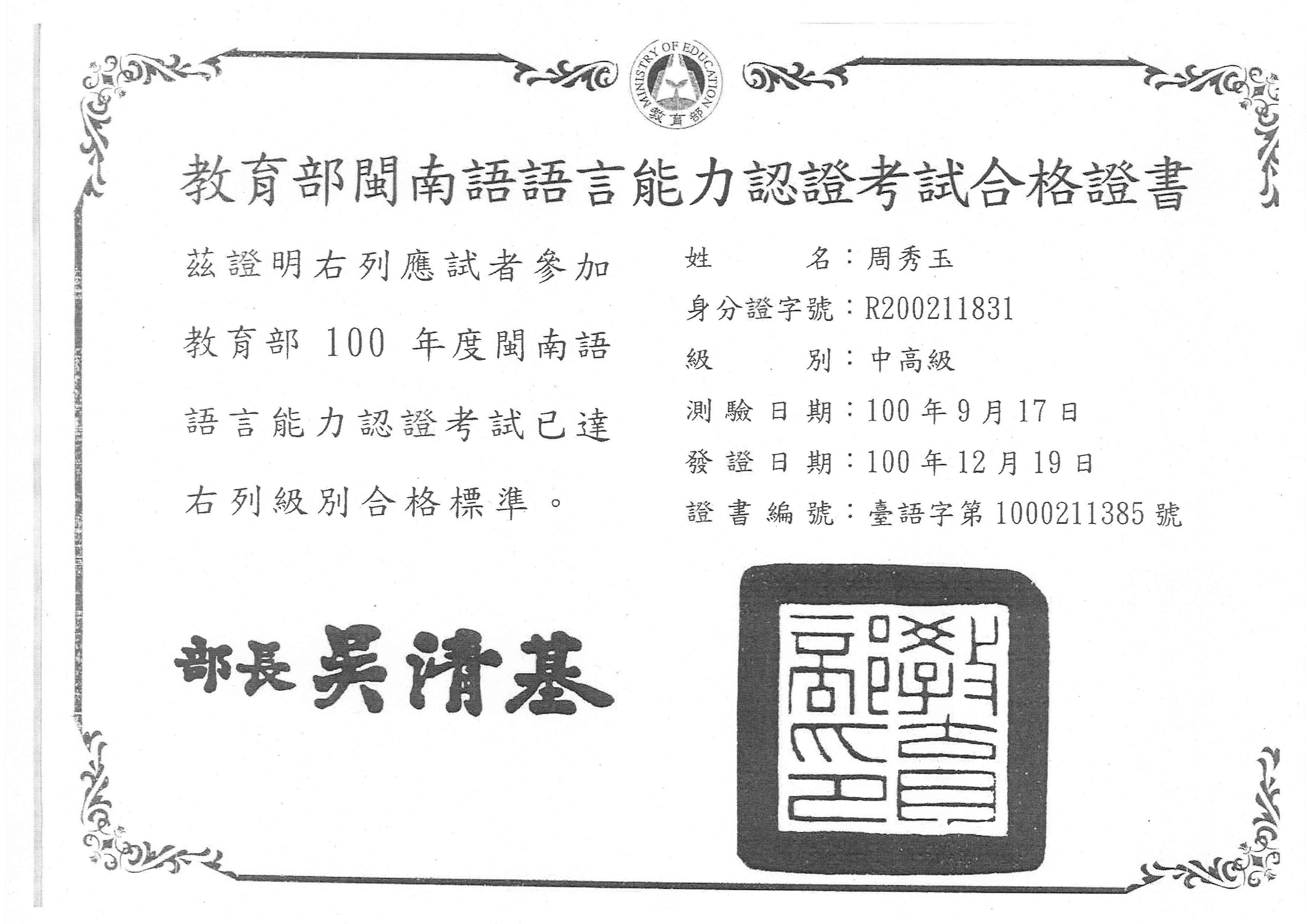 周秀玉中高級證書