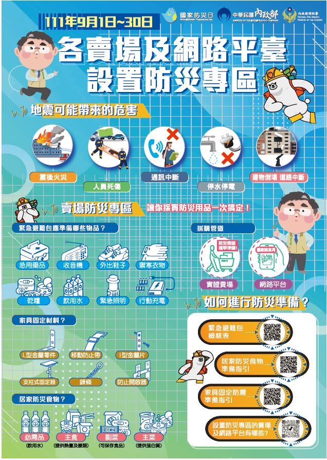 每年國家防災日,藉由實體賣場及網路平臺設置「防災專區」,以加強民眾落實防災各項準備,落實自主防災準備。