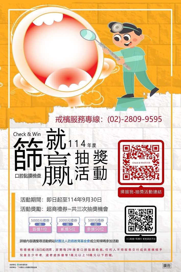 (三)參加方法:參加者掃描活動海報 QR code 線上填寫基本資料及完成「檳榔健康危害暨宣導意見調查問卷」後即可參加抽獎。