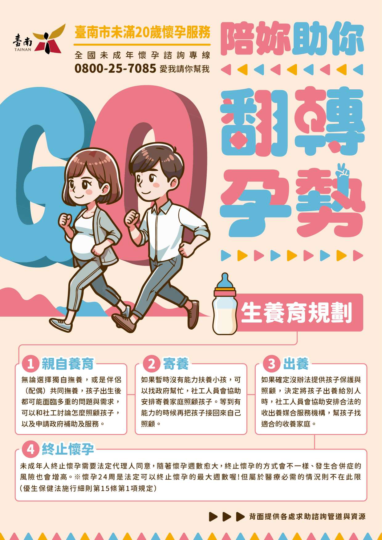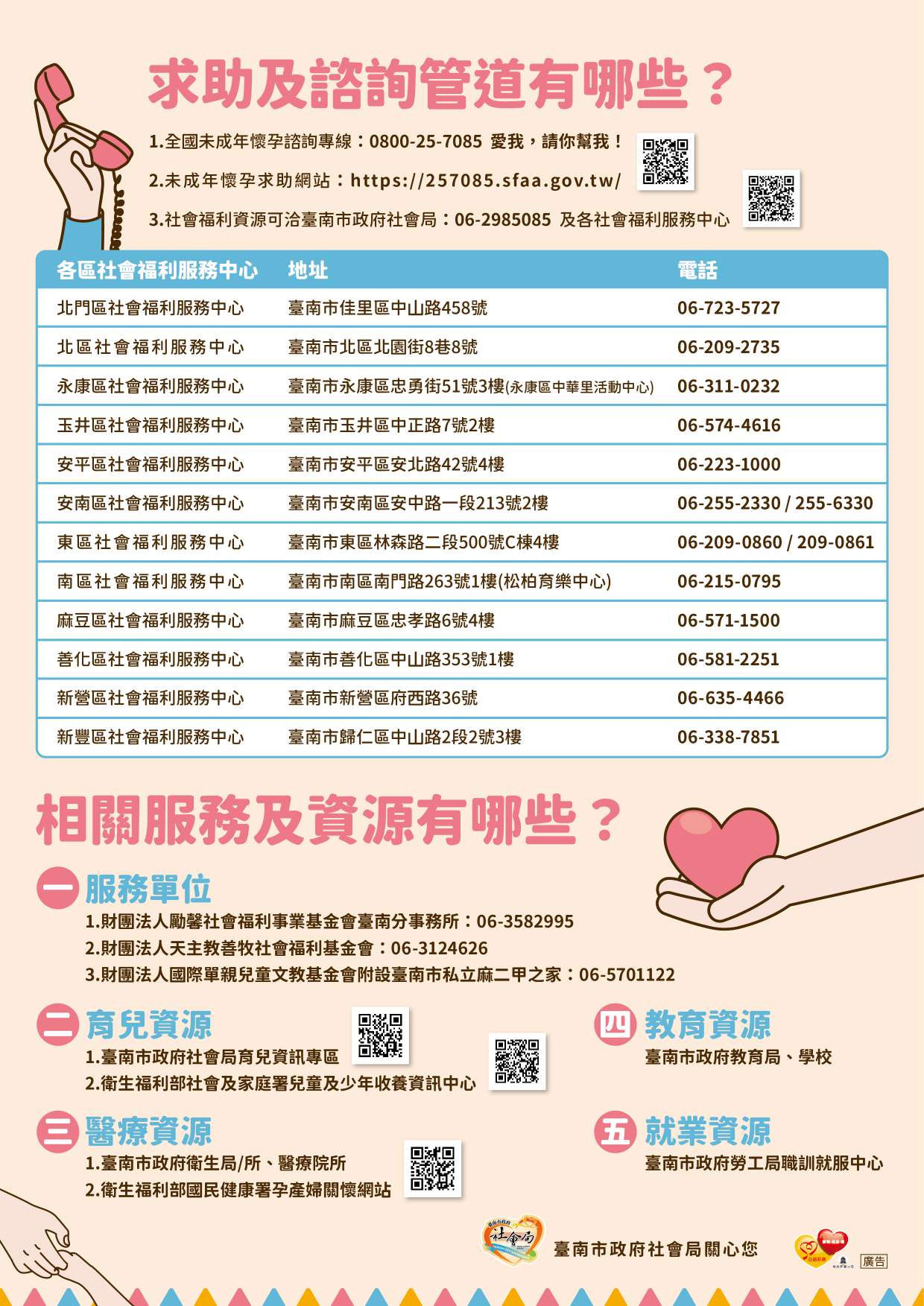 為提供社會大眾知悉預防未滿 20 歲懷孕事件及宣導未滿 20 歲懷孕服務社會資源,對於未滿 20 歲懷孕當事人相關服務及求助管道資訊,衛生福利部社會及家庭署設置「未成年懷孕求助網站」( https://257085.sfaa.gov.tw/ )及未成年懷孕諮詢專線( 0800-25-7085 ),另本局亦製作「陪妳、助你-翻轉孕勢」宣導單張,提供遭遇困境未成年懷孕少女、家屬及其重要他人近便性、即時性諮詢管道。