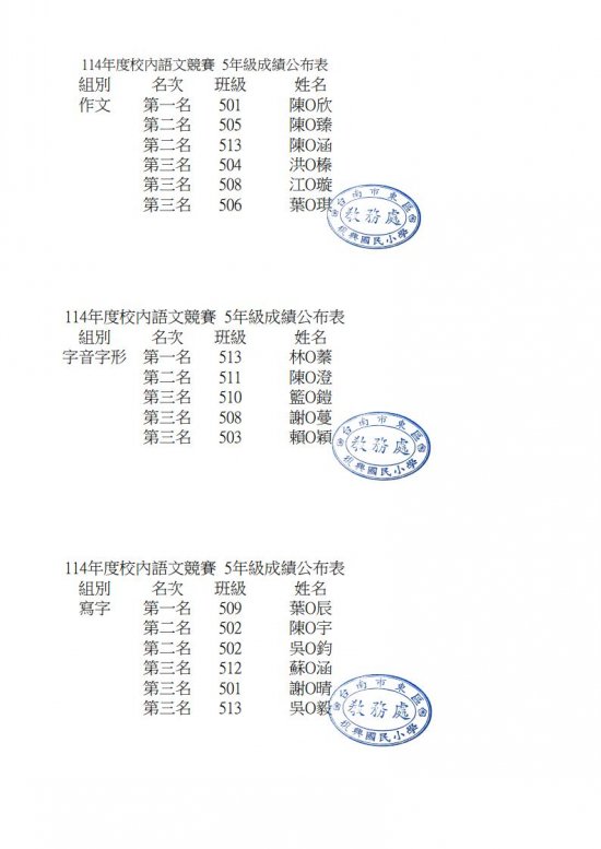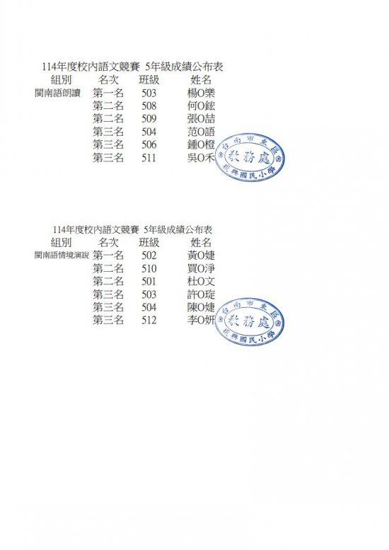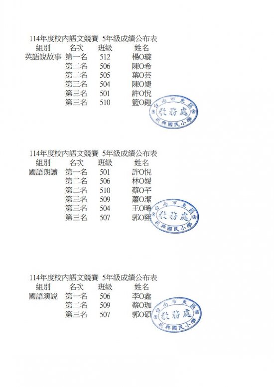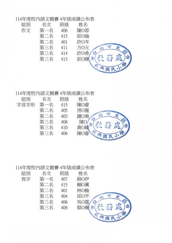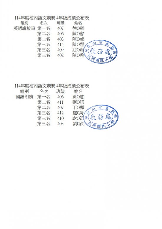 東區復興國小 114 年度語文競賽 成績如下,恭喜獲獎的小朋友。