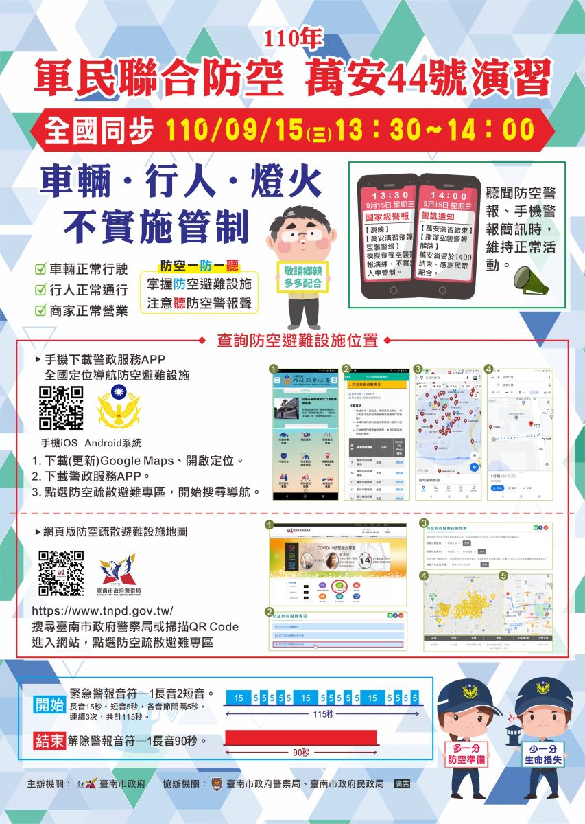 訂於 110 年 9 月 15 日(週三)13 時 30 分至 14 時全國同步實施防空警報及空中威脅告警系統簡訊發放演練,