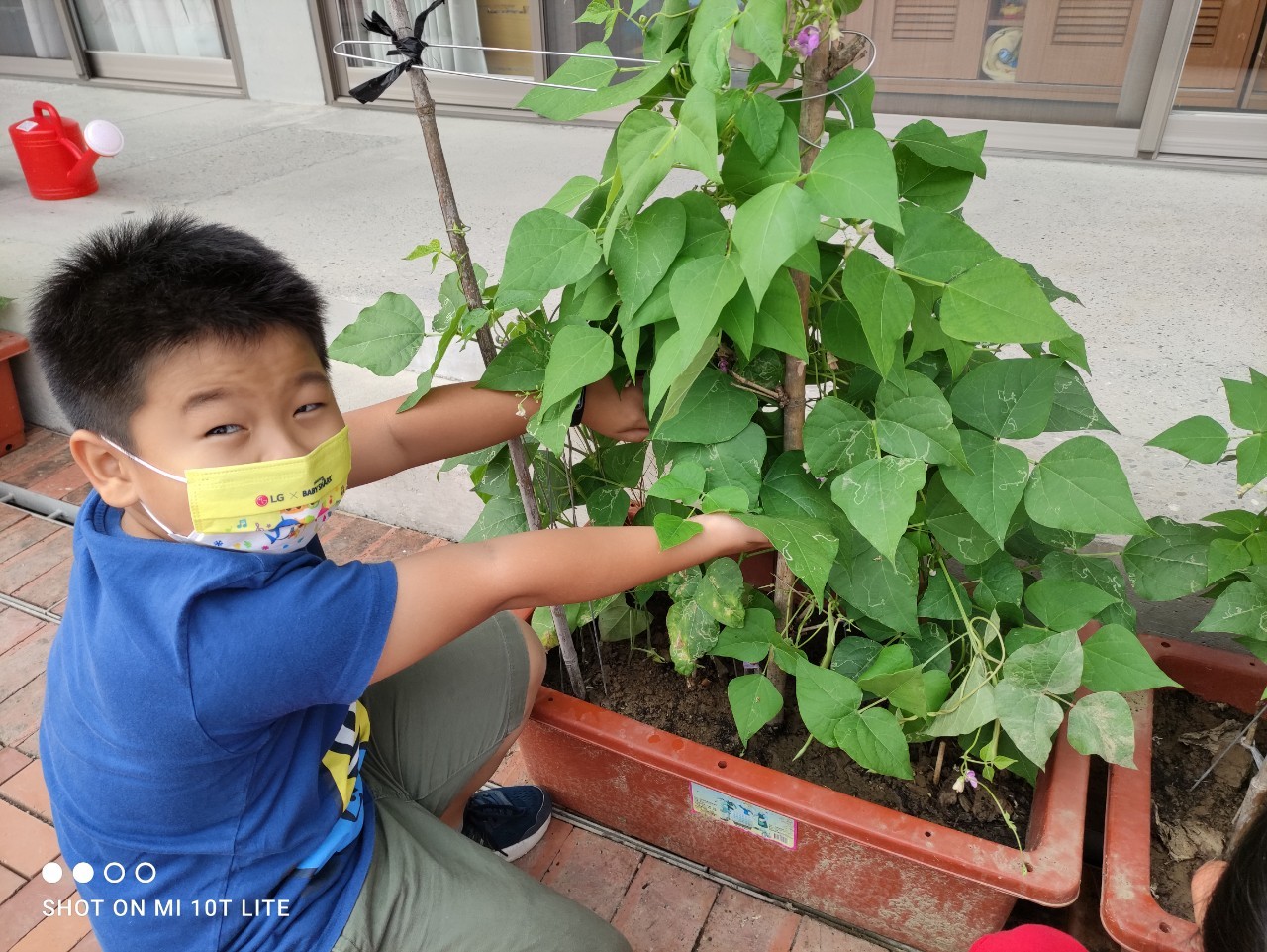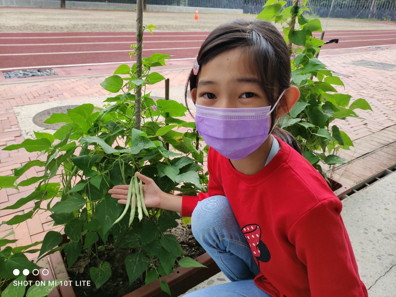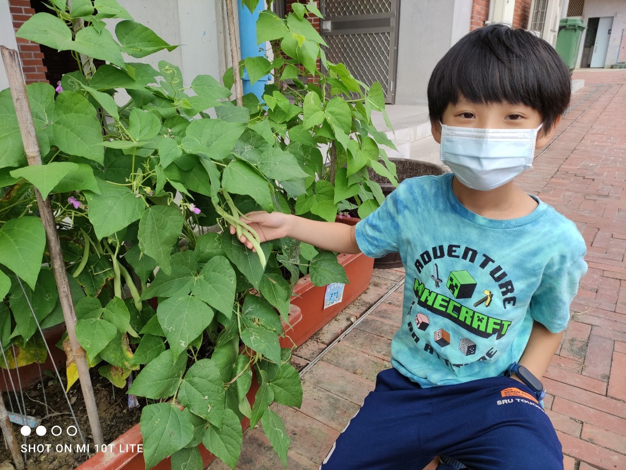 利用校園一角建置自給農園的四季豆從 10 月 08 日翻土、播種、澆水、施肥、長出藤蔓、立竿、開花、結莢,豆莢長大了, 11 月 22 日開始採收,享受採收與嚐鮮的喜悅。