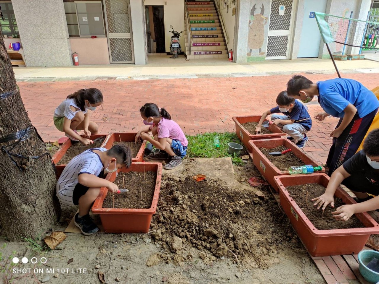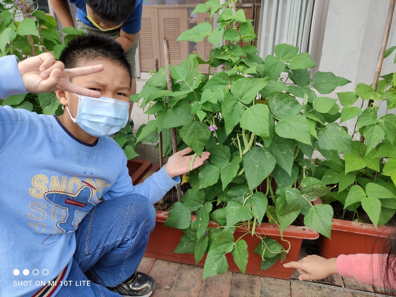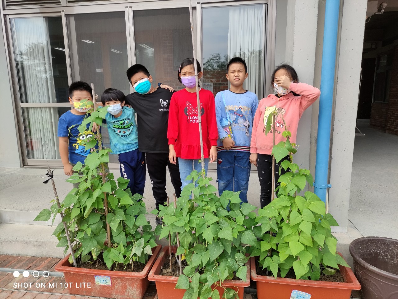 利用校園一角建置自給農園的四季豆從 10 月 08 日翻土、播種、澆水、施肥、長出藤蔓、立竿、開花、結莢,豆莢長大了, 11 月 22 日開始採收,享受採收與嚐鮮的喜悅。