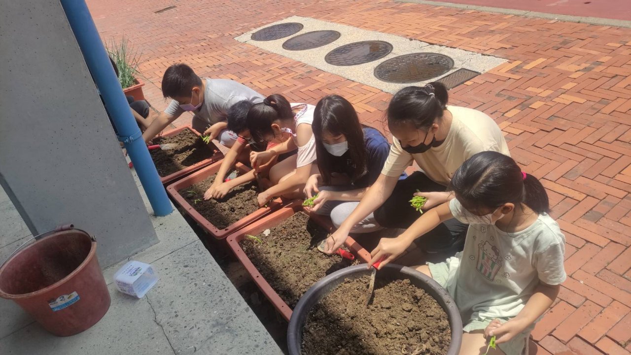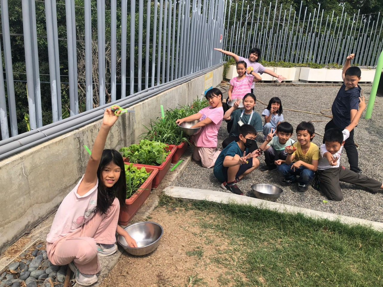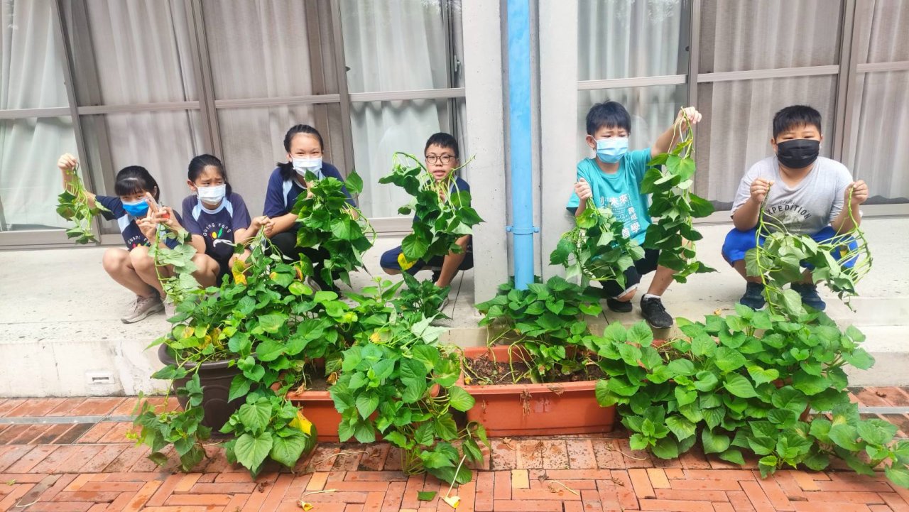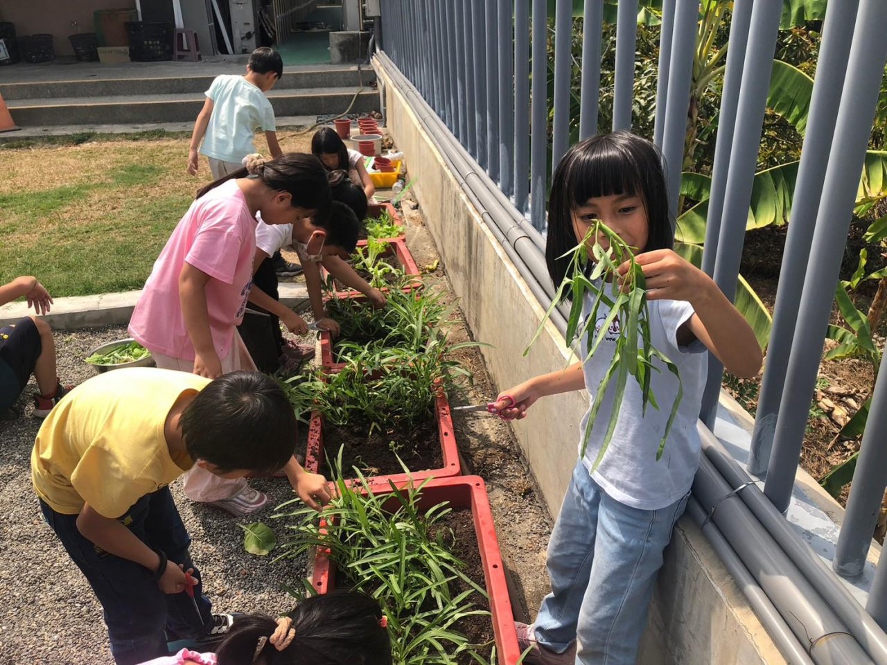 利用校園三處建置盆栽式自給農園,種植空心菜、蘿蔔、青蔥、番茄,從翻土、種下幼苗、澆水、施肥、採收,讓學生實際從做中學,享受採收、烹調與嚐鮮的快樂。