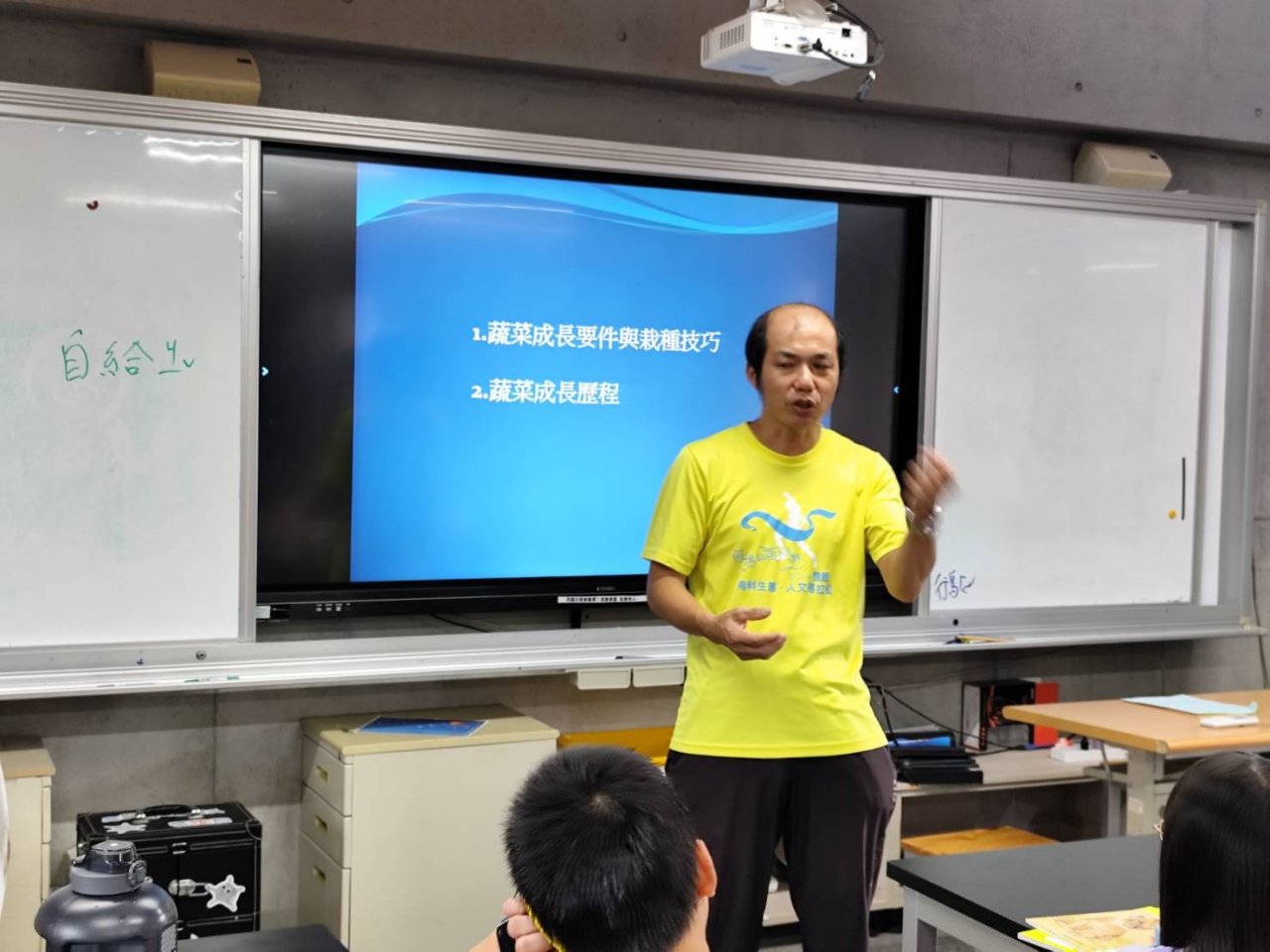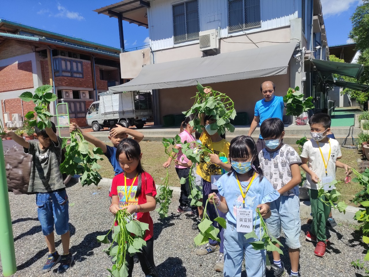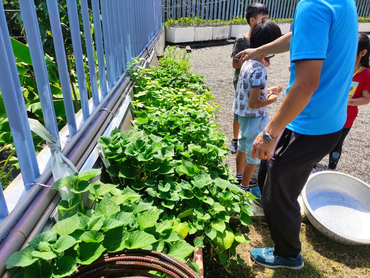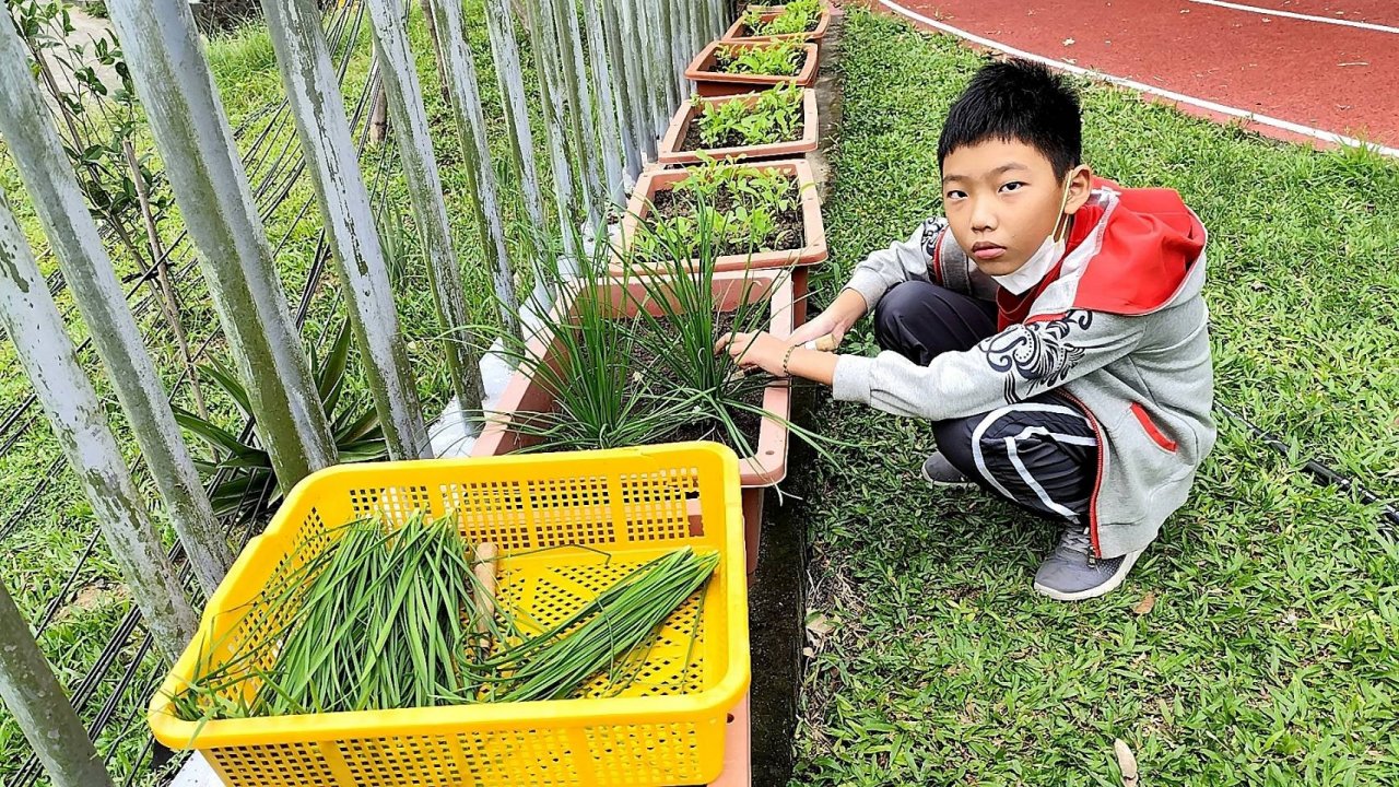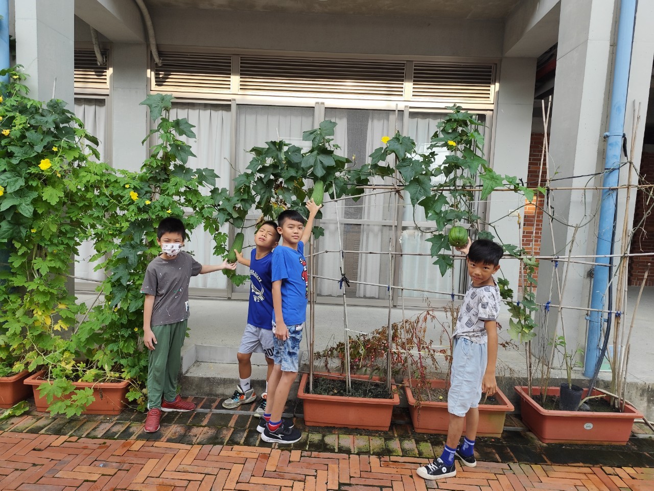 利用校園三處建置盆栽式自給農園,種植絲瓜、地瓜葉、青蔥、韭菜,從翻土、種下幼苗、澆水、施肥、採收,讓學生實際從做中學,享受採收、烹調與嚐鮮的快樂。
