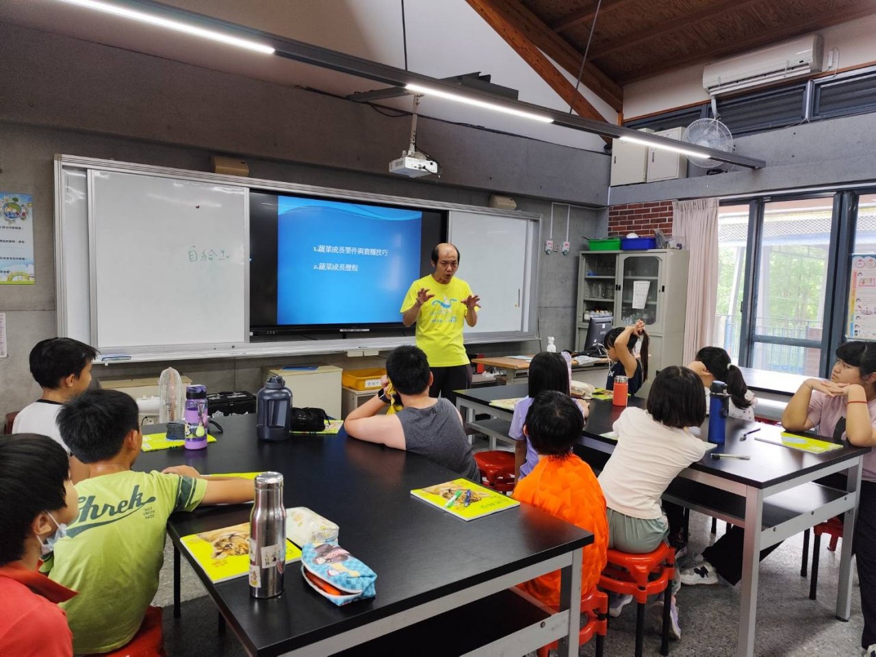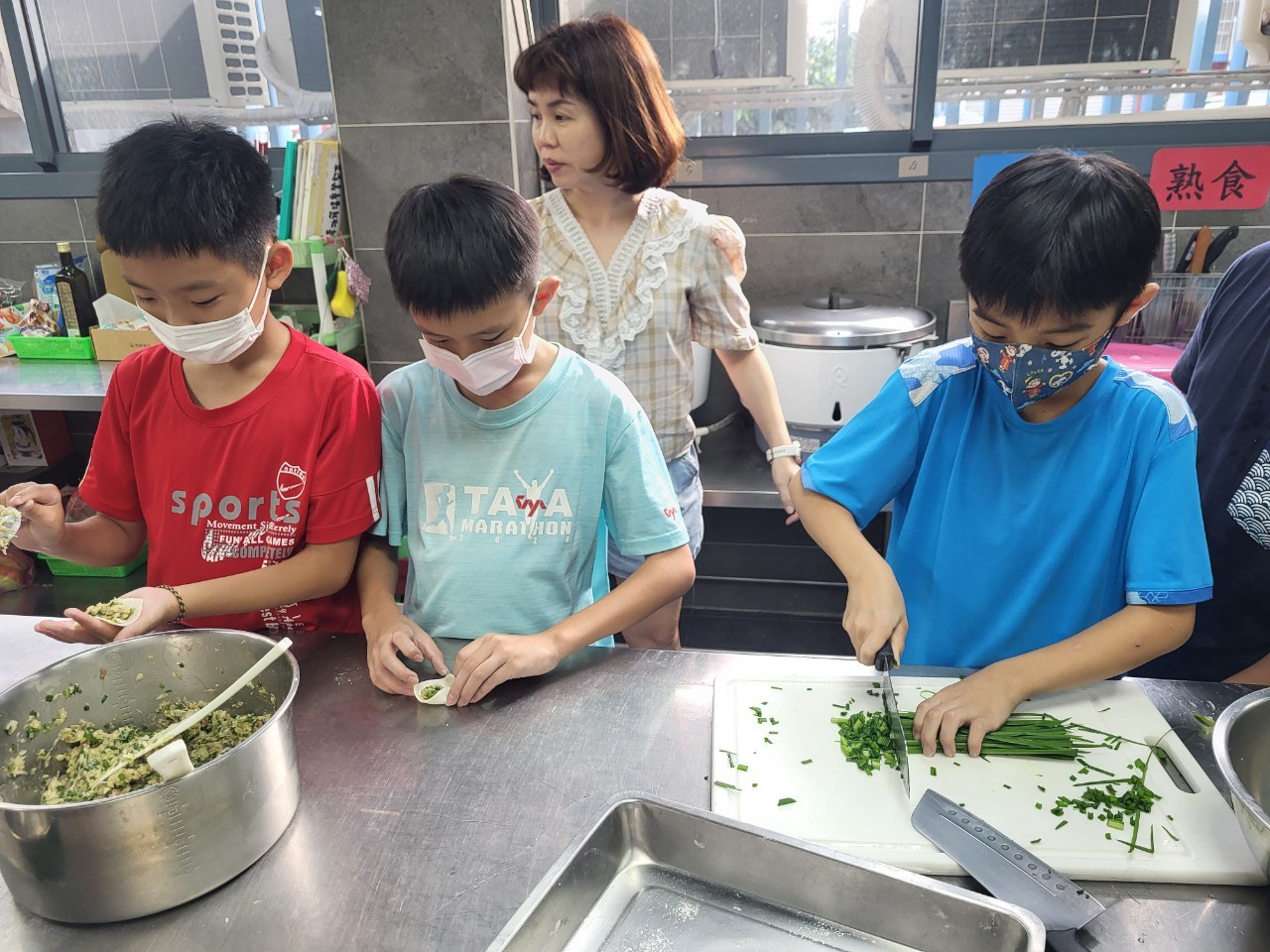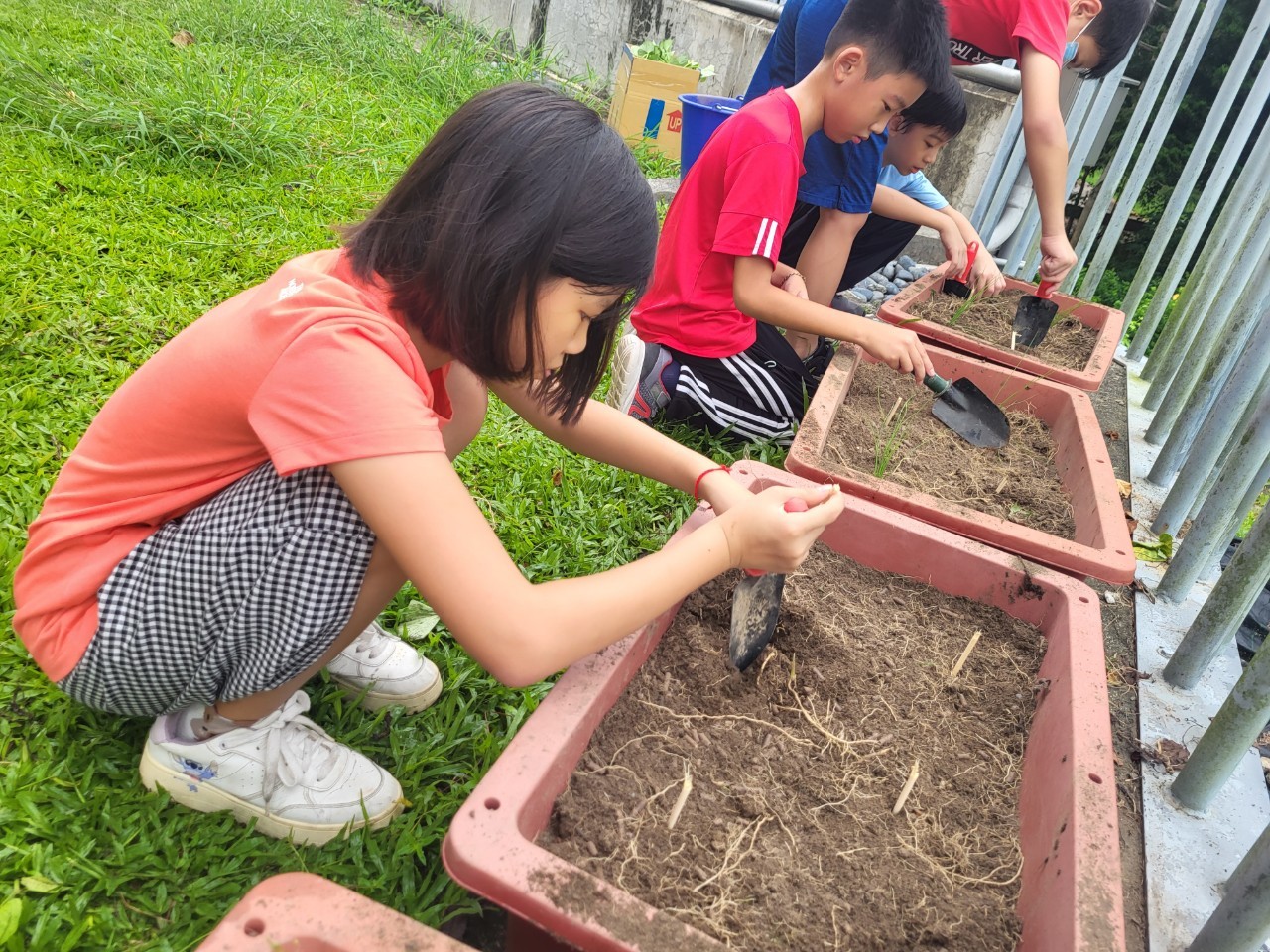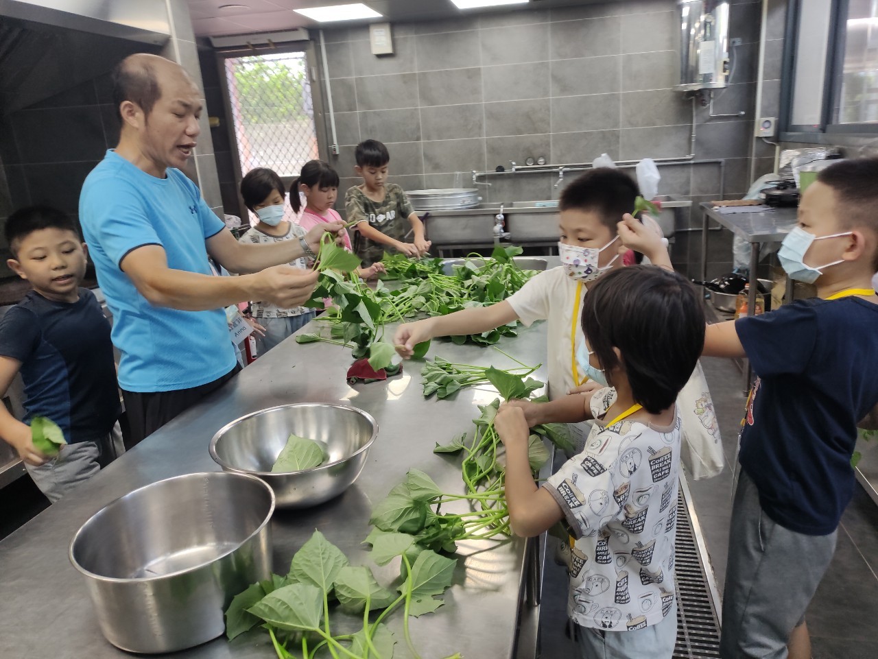 利用校園三處建置盆栽式自給農園,種植絲瓜、地瓜葉、青蔥、韭菜,從翻土、種下幼苗、澆水、施肥、採收,讓學生實際從做中學,享受採收、烹調與嚐鮮的快樂。