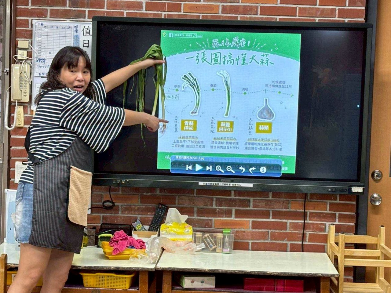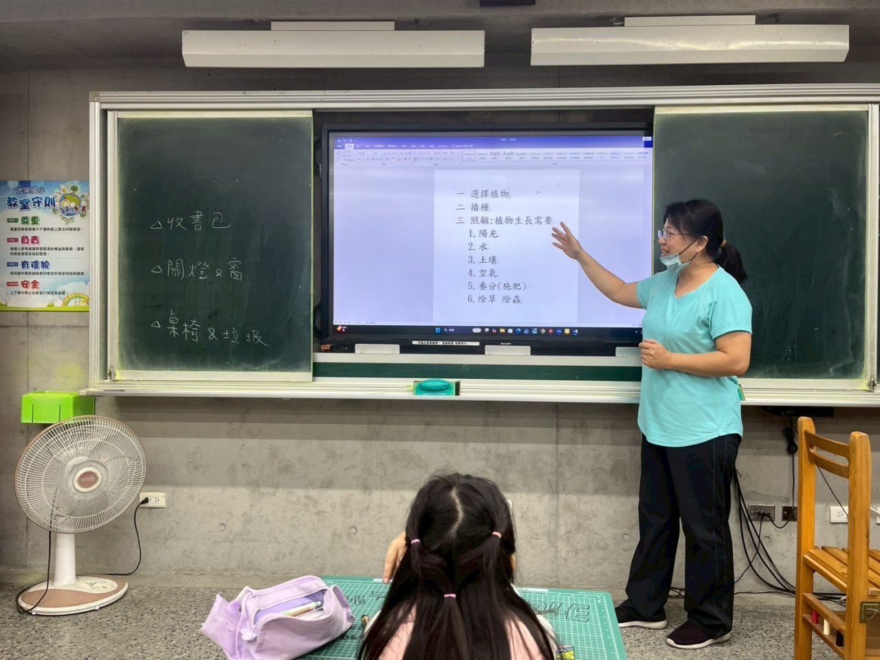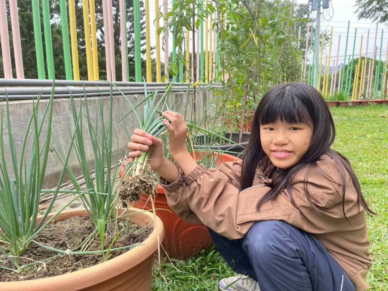 二、利用校園建置盆栽式自給農園,種植小白菜、番茄、青蔥、韭菜、空心菜,從翻土、種下幼苗、澆水、施肥、採收、烹調,讓學生實際從做中學,達成食農教育倡導低碳飲食成效。