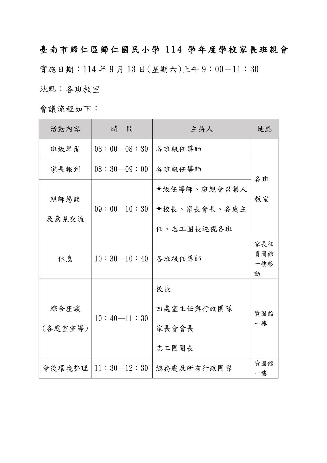 臺南市歸仁區歸仁國民小學 114 學年度家長班親會