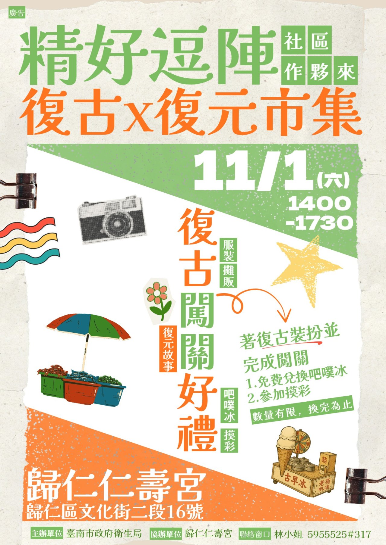 四、為因應關廟區社區心理衛生中心成立週年,串聯社區團體、學校與民間單位,共同參與活動,深化資源合作,強化心理衛生中心與社區的支持網絡連結,集結康復者手作創意、舞台表演、社區團體與在地商家,打造一場充滿懷舊氣息與心理健康教育的社區慶典。