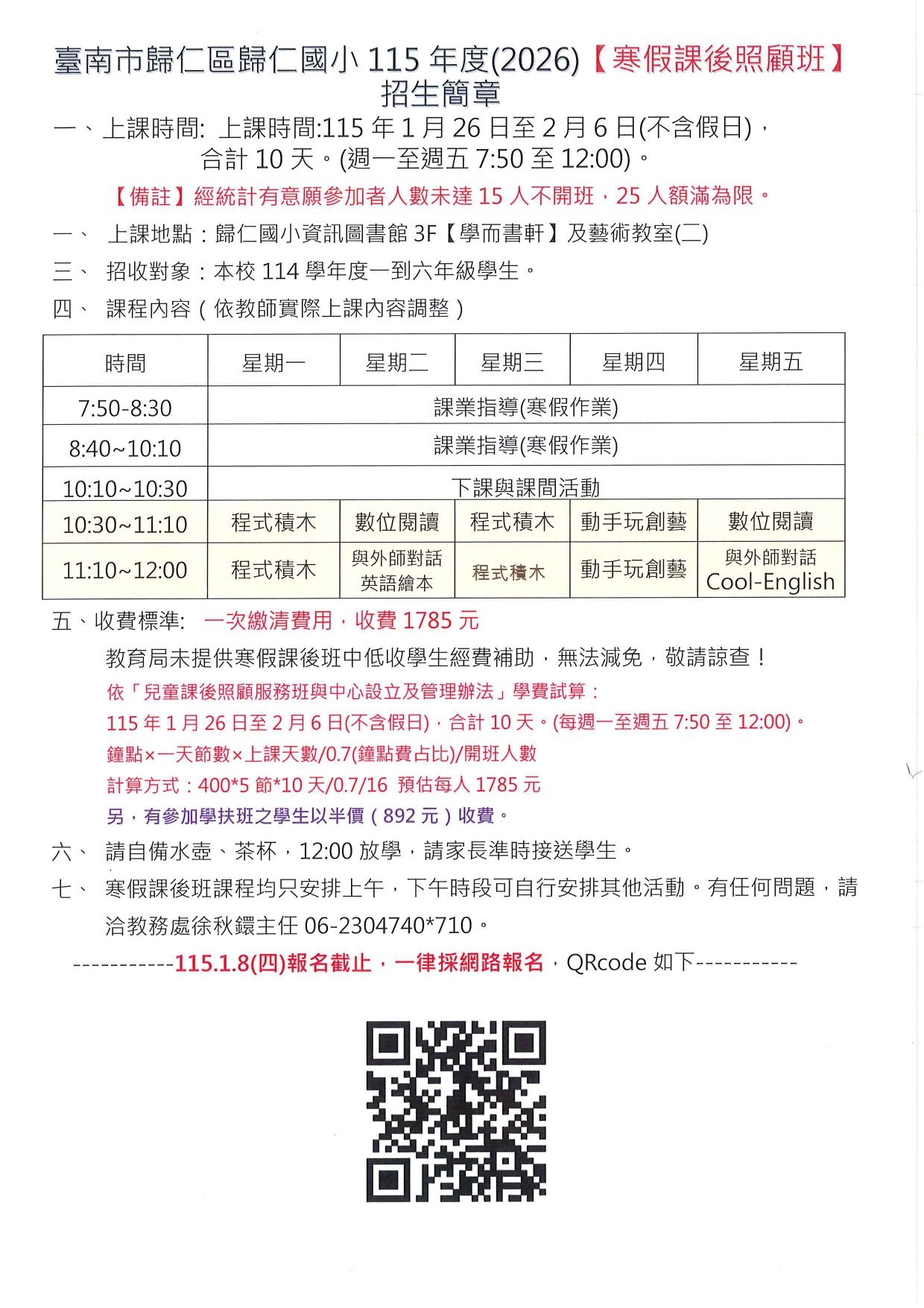 寒假課後照顧班上課日期:1/26(一)-2/6(五) AM7:50-12:00