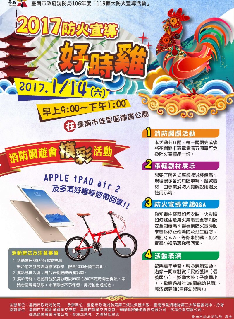 二、為推廣防火安全教育向下紮根工作,本府消防局特於106年1月14日(「2017防火宣導好時雞」活動)上午9時至13時假佳里區體育公園及於106年1月15日(「2017金雞賀歲,平安順遂」活動)上午7時至12時假新營區文化中心旁廣場,舉辦消防安全嘉年華活動,藉由親子活動宣達防火知識。