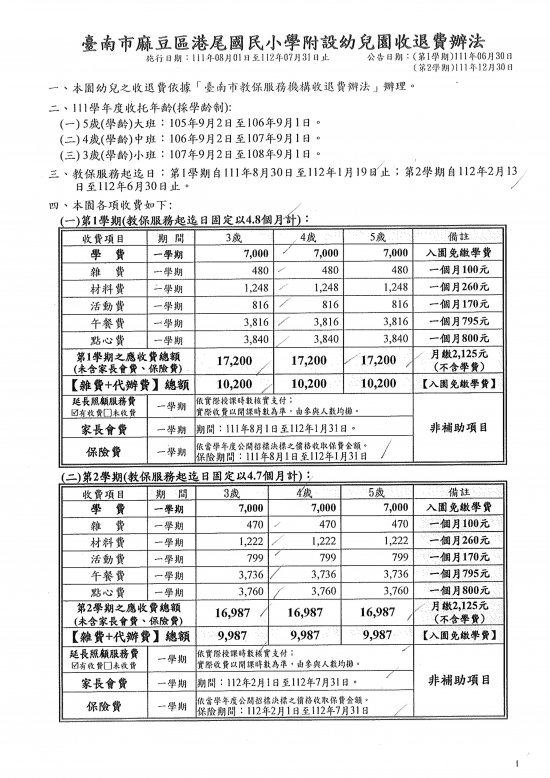 臺南市麻豆區港尾國民小學附設幼兒園收退費辦法