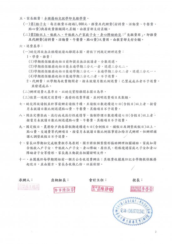 一、本園幼兒之收退費依據「臺南市教保服務機構收退費辦法」辦理。