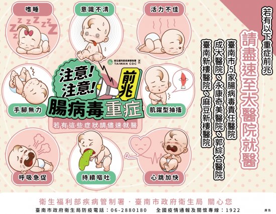(一)注意腸病毒重症警訊!若您的孩子出現嗜睡、意識不清活力不佳、肌躍型抽搐、手腳無力、呼吸急促、持續嘔吐、心跳加快等重症前兆,請儘速前往大醫院就醫!腸病毒可能引發嚴重併發症,務必提高警覺。臺南市 5 家腸病毒責任醫院:成大醫院、永康奇美醫院、郭綜合醫院、臺南新樓醫院、麻豆新樓醫院。預防勝於治療,勤洗手、避免接觸病童,共同守護孩子健康!